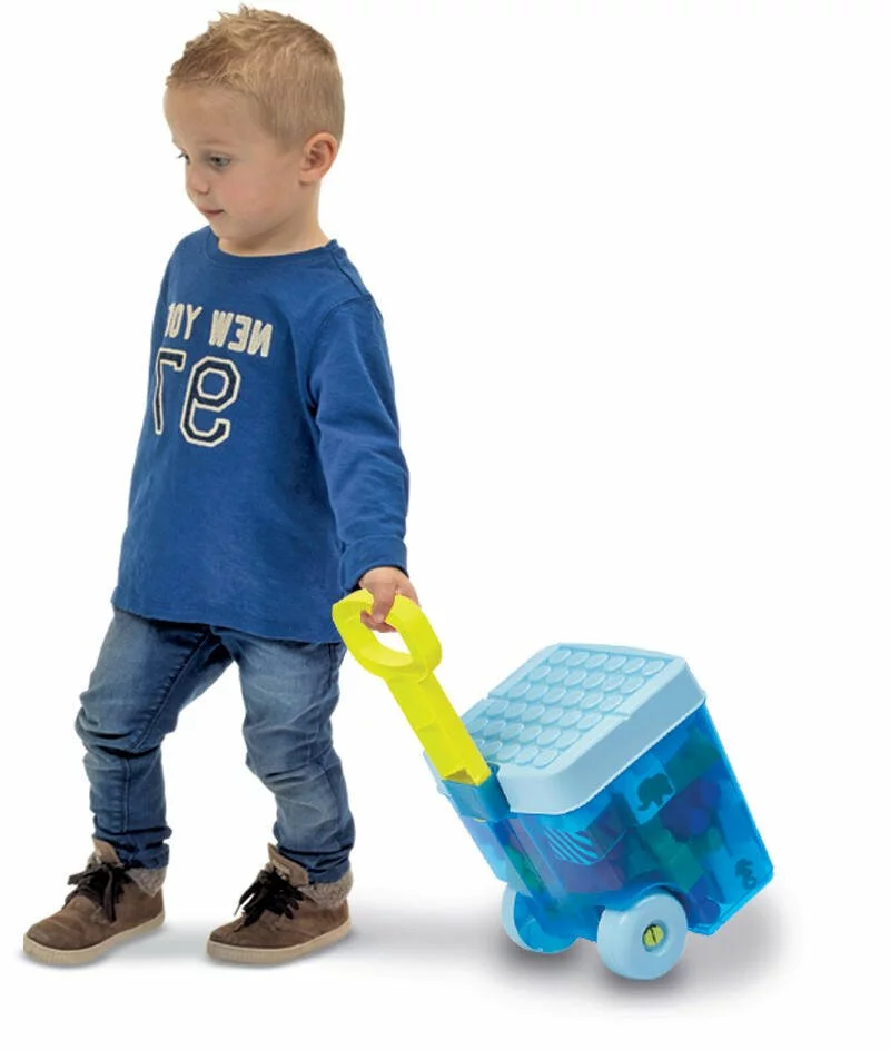 Un chariot au bac translucide rempli de 40 briques. Le couvercle sert de base de jeu et la poignée est rétractable.