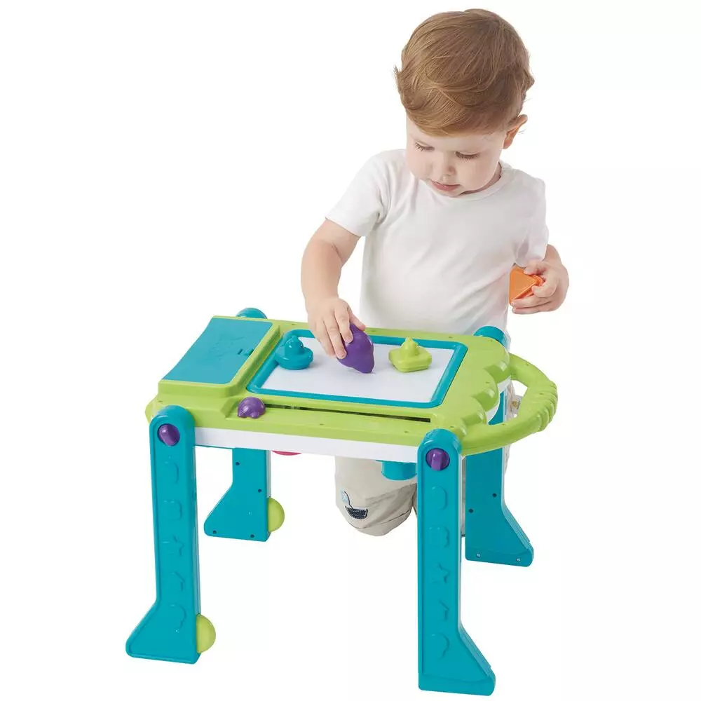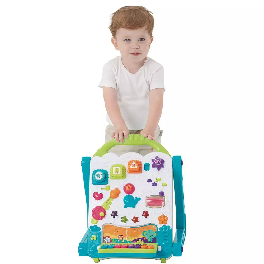 Mon Tableau Trotteur 3 en 1, sur le thème de l’océan, accompagne les enfants dans leurs apprentissages de 9m+ à 18m+ ! PANNEAU D’ACTIVITÉ (9m+) : différentes expériences de jeux pour éveiller l’enfant (piano, comptines françaises, boite à forme avec apprentissage des noms en français, sons, jeux d’action/réaction…). AIDE A LA MARCHE (12m+) : accompagne l’évolution de la motricité de l’enfant. TABLE DE DESSIN (18m+) : le panneau d’activité peut être inversé pour se transformer en tableau magique où l’enfant peut faire des tampons, dessiner… Avec sons et lumières. Avec plus de 25 chansons – Effets sonores et lumineux.