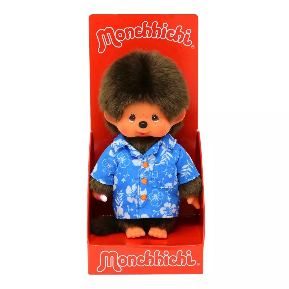 2 peluche Monchhichi 20 cm prête à partir à Hawaï avec sa jolie chemise à fleur et ses boutons dorés!