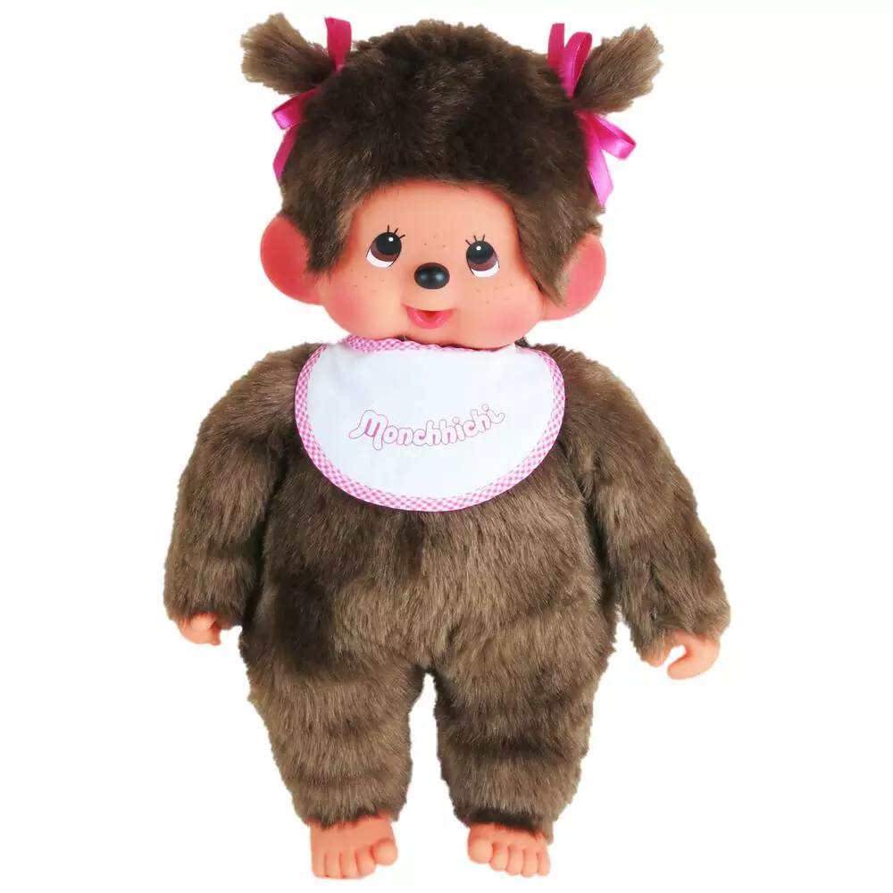 Un grand Monchhichi Fille de 45 cm pour de grands câlins, trop mignonne avec son bavoir et ses petits nœuds roses !