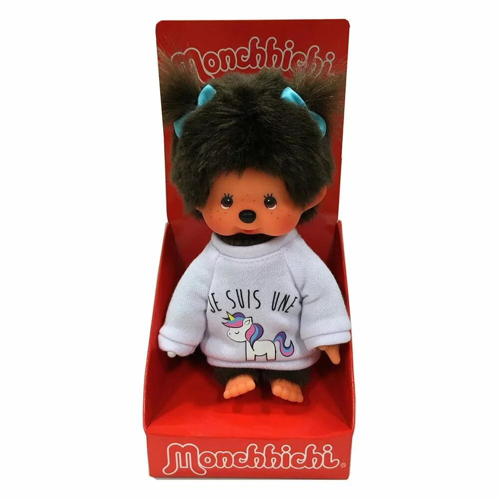 Un Monchhichi plus tendance que jamais à avoir de toute urgence ! Elle est vraiment trop mignonne avec son petit pull licorne !