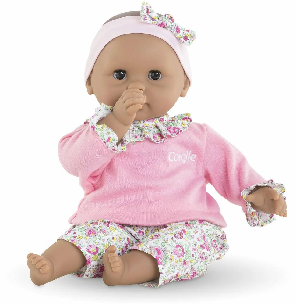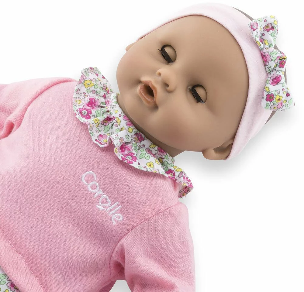 Bébé Calin Maria est un petit poupon de 30 cm; la taille parfaitement adaptée aux petits bras et mains de l’enfant pour le manipuler. Son corps souple lui permet de prendre les mêmes positions qu’un vrai bébé. Son visage; ses bras et ses jambes; à la délicate senteur de vanille; sont en vinyle doux au toucher. Son pouce peut se maintenir dans sa bouche comme un vrai bébé. Avec ses yeux marron dormeurs; il fait dodo quand on le couche sur le dos. Il est habillé d’une tenue 2-en-1 composée d’un pantalon fleuri et d’un T-Shirt rose manches longues et coiffé d’un bandeau assorti. Bébé Calin Maria dispose d’une collection variée de vêtements et d’accessoires dans la gamme mon premier poupon Corolle pour pouponner pour la première fois.