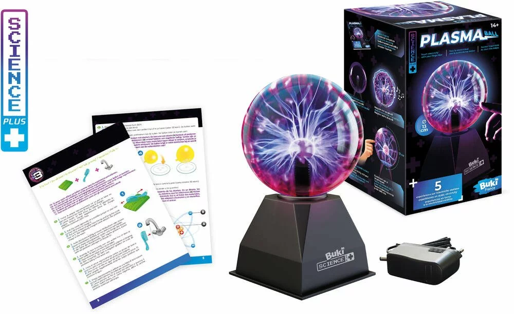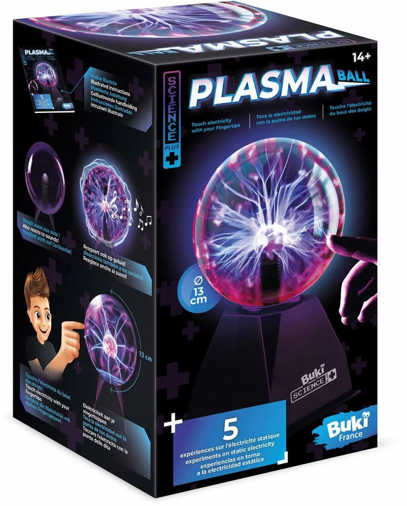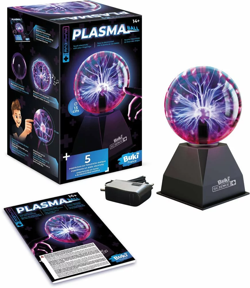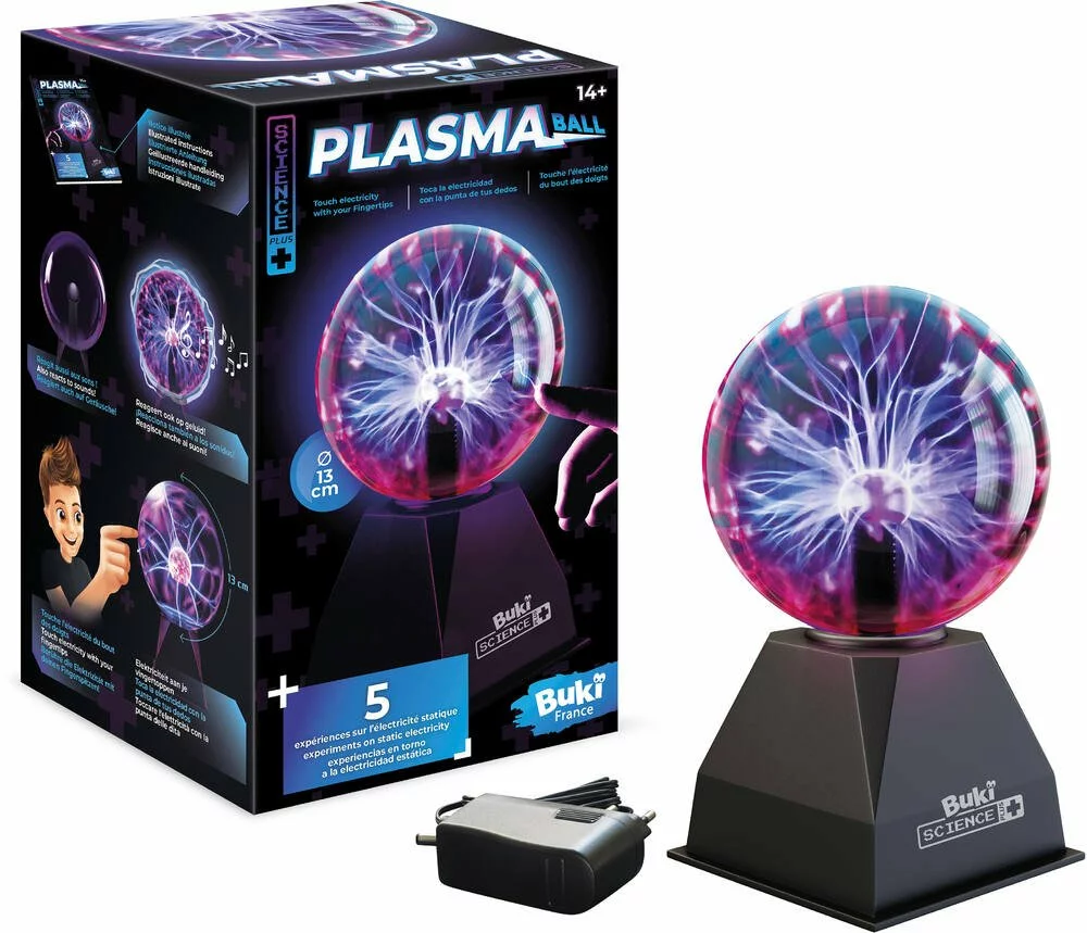 Une boule plasma de 13 cm de diamètre, idéale pour décorer la chambre. Elle réagit au toucher et crée des éclairs d’électricité sans danger. Réagit aussi aux sons ! Inclus : 5 expériences étonnantes sur l’électricité statique. Notice illustrée en couleurs. Elle réagit aussi aux sons. Effets lumineux. Prise secteur incluse.