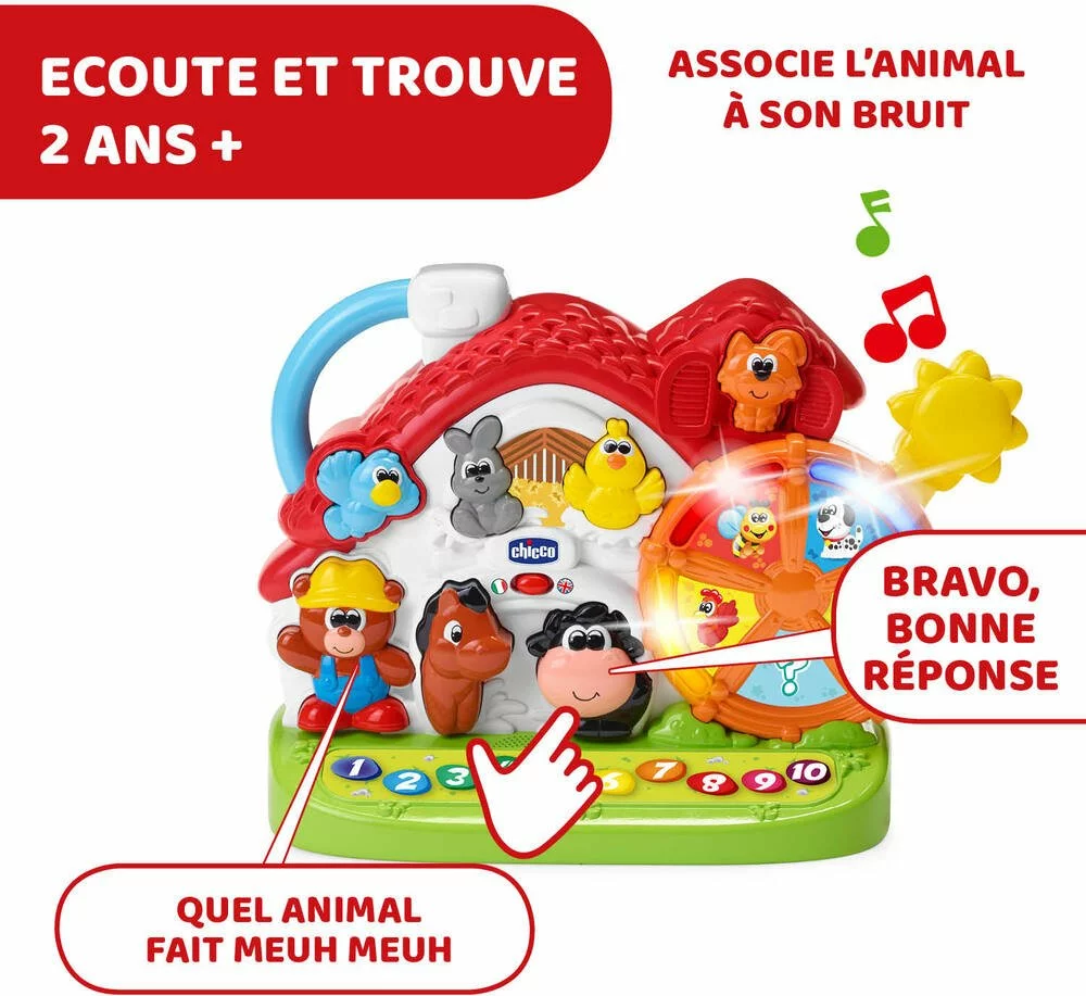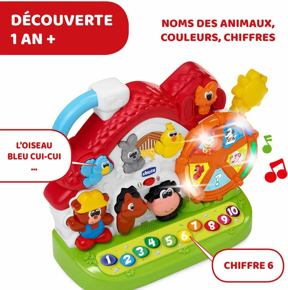 Ferme qui apprend aux tout petits les animaux de la ferme en français et en anglais. Ainsi que plus de 50 mots, questions chansons et sons. Effets sonores et lumineux.
