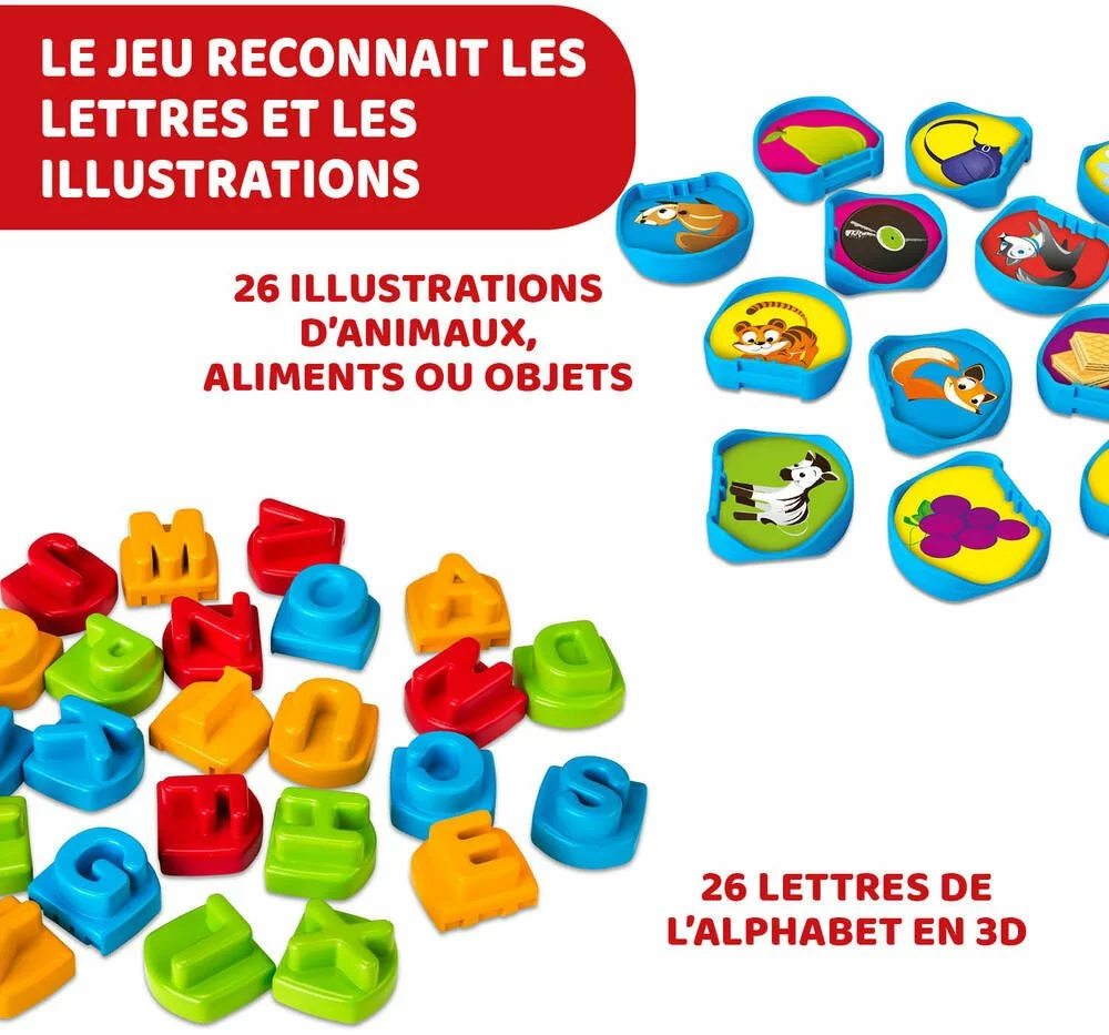 Apprends les lettres et les premiers mots ! 3 modes de jeu évolutifs avec fonction auto-correctrice. 26 lettres incluses et 26 mots à composer. Boîte de rangement integrée. Effets sonores et lumineux.