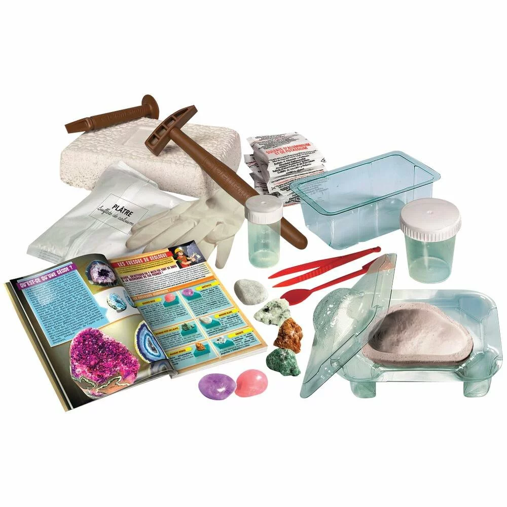 Le kit Cristaux et pierres précieuses contient un bloc de terre, des pierres et minéraux, un marteau, un burin, un sachet de plâtre, des sachets de sulfate d’aluminium et de potassium, une pincette, une spatule, des gants en latex, deux verres avec couvercle, un moule pour géode et un manuel illustré.