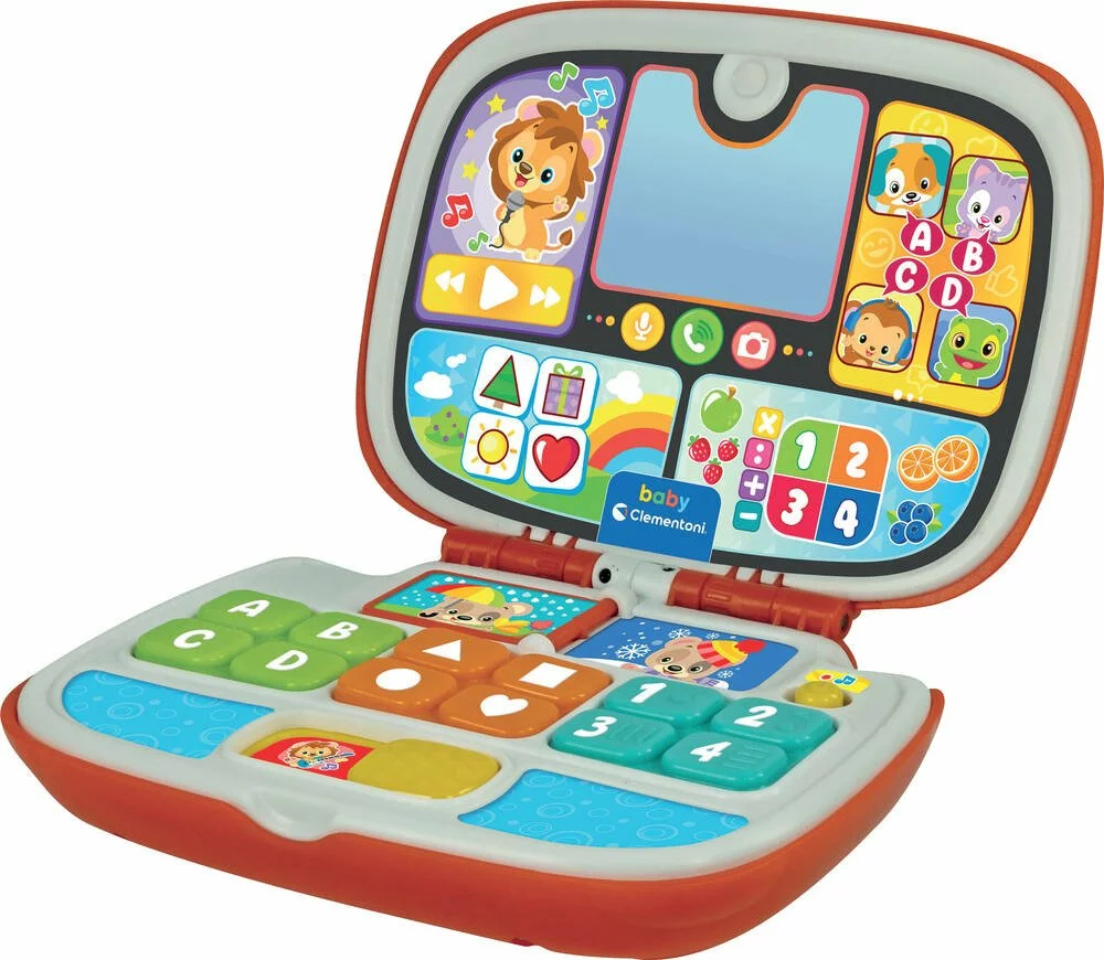 Bébé pourra prendre exemple et imiter ses parents avec cet ordinateur portable conçu spécialement pour eux. Les effets lumineux, le miroir pour voir son reflet, les sons typiques du monde informatique et le design d’un véritable ordinateur laisseront place à l’imagination. Avec 5 activités éducatives et interactives, l’enfant pourra s’imaginer en visio avec ses amis les animaux, écouter sa musique, regarder des photos ou faire des calculs avec la calculatrice. Enseigne les premières lettres, les chiffres, les formes, les couleurs et de nombreux mots grâce à d’amusantes comptines.