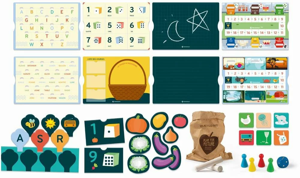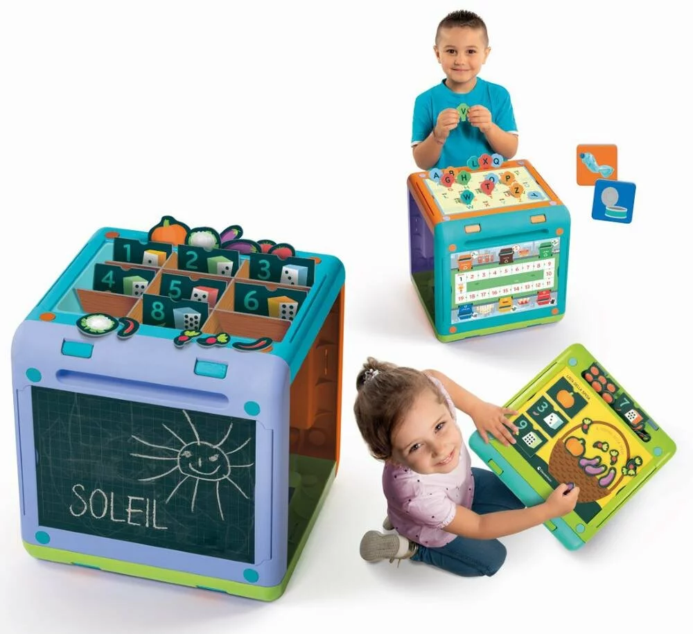 Un cube d’activités original en plastique et en carton recyclé avec 4 plateaux de jeu différents et des accessoires pour de nombreux jeux éducatifs. Les enfants apprennent en jouant avec les lettres, les chiffres, les animaux, les formes et les couleurs, et en s’amusant avec des activités liées à l’environnement et au recyclage. Chaque côté du cube est un plateau de jeu et contient un espace de stockage contenant des tuiles, des cartes et des composants pouvant être utilisés de différentes manières, ainsi que des suggestions d’activités supplémentaires avec des matériaux recyclés. Le jeu de l’alphabet aide les enfants à apprendre l’alphabet en associant des images à leurs lettres initiales à insérer dans le tableau de l’alphabet. Le jeu des chiffres avec le potager aide les enfants à compter en disposant les légumes dans les compartiments en les associant aux étiquettes indiquant les quantités respectives. Un jeu de parcours coopératif apprend aux enfants à respecter la nature et la collecte triée des déchets, les invitant à jouer tout en nettoyant leur environnement.