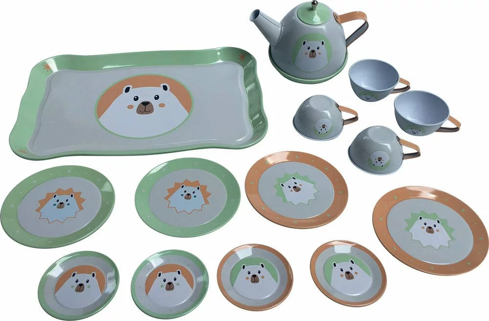 15 pièces. Avec 1 plateau (24 x 15.7 x 1 cm), 1 théière avec couvercle (12.8 x 9 x 8.8 cm), 4 assiettes (9 x 0.6 cm), 4 tasses (6.5 x 5 x 3 cm) et 4 sous-tasses (5.8 x 0.5 cm). En métal. Coffret complet.
