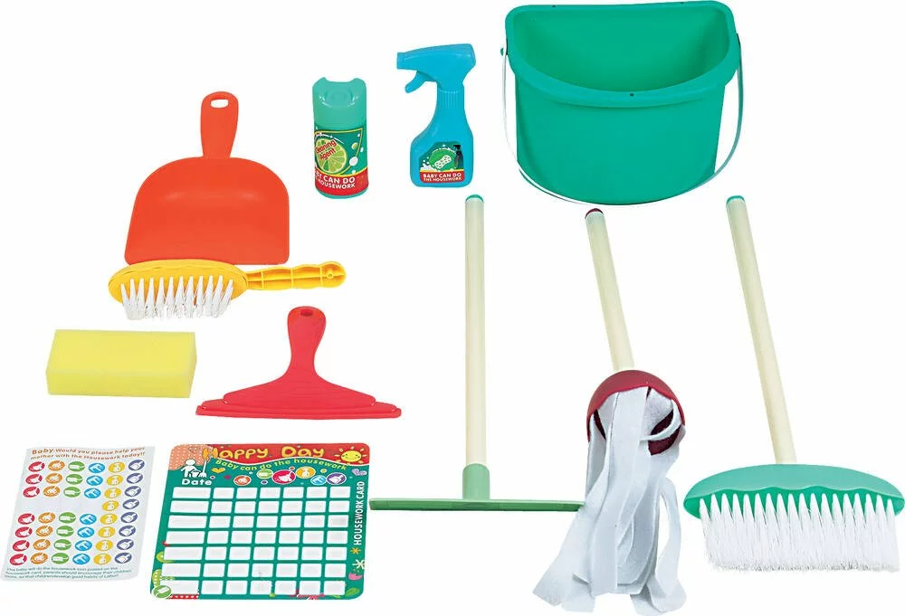 Coffret ménage contenant de nombreux accessoires dont : 1 balai à franges, 1 balai, 1 balai serpillère, 1 brosse, 1 pelle à poussière, 1 vaporisateur (flacon spray), 1 détergent, 1 raclette, 1 éponge, 1 seau, 1 carte (calendrier de ménage) et des autocollants.