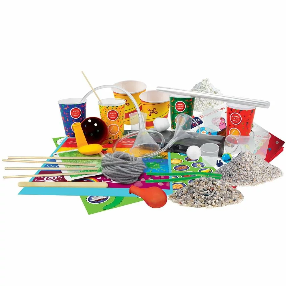 Des expériences étonnantes pour découvrir le monde en utilisant tes 5 sens ! Initier l’enfant à la découverte des 5 sens : le toucher, l’ouïe, le goût, l’odorat et la vue. Créer un sac sensoriel pour découvrir le toucher, étudier comment les sons voyagent, comment les yeux reconnaissent les couleurs, ressentir les odeurs et les goûts. 19 expériences ou activités. 40 pièces. Contient : une carte avec éléments graphiques, une carte avec éléments sensoriels, du terreau pour les plantes, des gobelet en papier, une balle en polystyrène, un bâtonnet en bois, des verres test, des petits verres à mesurer, des graines de camomille, du film transparent, des tiges en bois, un pot de fleurs, une boule de coton, des ballons, un jeu de mémoire, du sable, une bille, des entonnoirs, du fil de laine, des tubes, des graviers, des fils chenilles (ou fils à modeler), de la farine de maïs et un livret éducatif illustré de 36 pages.