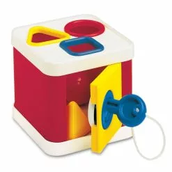 A partir de 12 mois, les tout-petits deviennent beaucoup plus curieux et aventureux. Ils adorent ranger, cacher et empiler les choses. Lors de cette phase, les bambins reconnaissent les formes et les couleurs et les sons familiers. Ambi toys propose des boîtes à formes ainsi que des jeux à empiler et à tirer. Montrez-lui comment faire les choses et il les fera très vite tout seul ! Cette solide boîte verrouillable est dotée de deux séries de blocs de formes différentes pour jouer sur l’association des couleurs et des formes. La serrure fait un bruit de roue à cliquet quand la clé géante inamovible tourne.