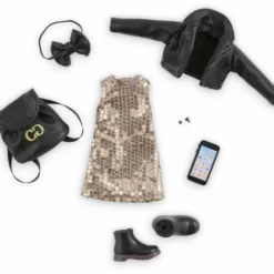 Le Dressing de Fête constitue une tenue complète composée de 7 accessoires ultra-tendance pour faire la fête : 1 robe dorée à sequins; 1 bandeau noir pour les cheveux;1 paire de boucles d’oreilles; 1 veste; 1 téléphone portable; 1 sac à dos et 1 paire de bottes noires amovibles. Le Dressing Soirée peut être combiné avec les autres Coffrets Dressing Corolle Girls et les Coffrets Poupées Corolle Girls pour stimuler encore plus l’imagination de vos enfants dès 4 ans.