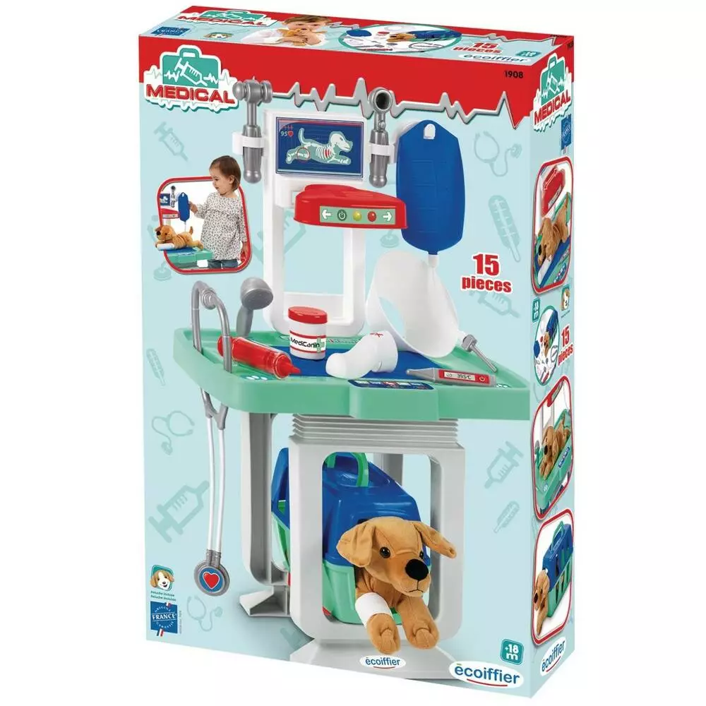 Comprend une table d’examen avec baignoire, pommeau de douche et un scanner. De nombreux accessoires dont une peluche.