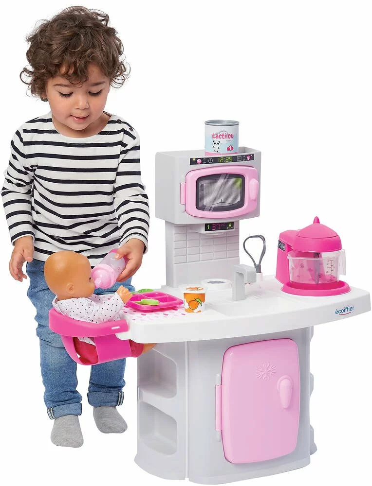 Tout est là pour que votre enfant puisse préparer un bon repas à son poupon (non inclus) avec cette cuisine de bébé comprenant un réfrigérateur, un micro-onde, et un chauffe biberon. 11 pièces.