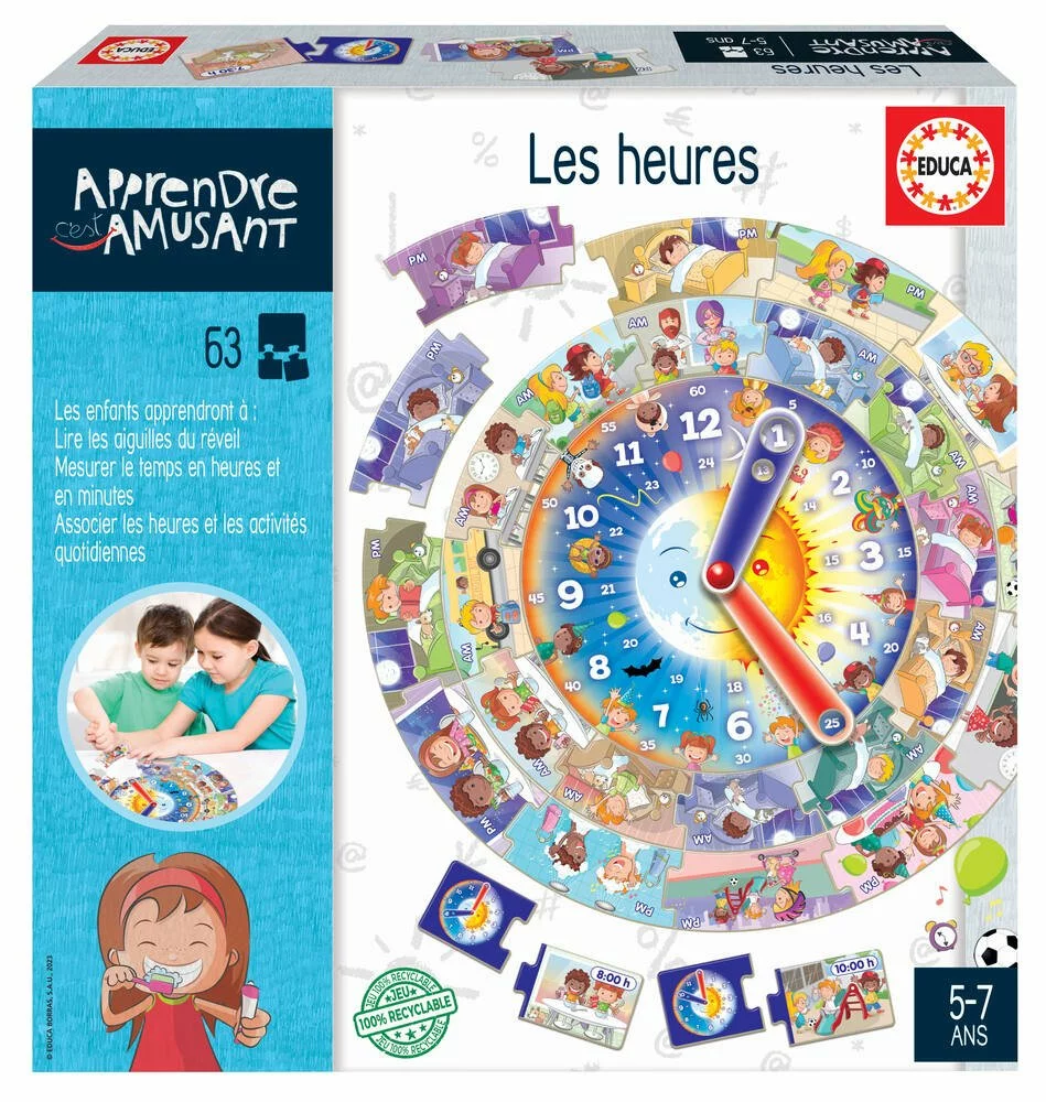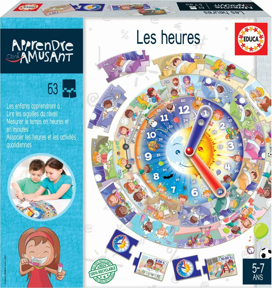 Apprends à lire l’heure et à l’associer à tes activités. 1 horloge à monter, 39 pièces d’heures et de scène et 12 pièces d’heures analogiques et numériques fournis.