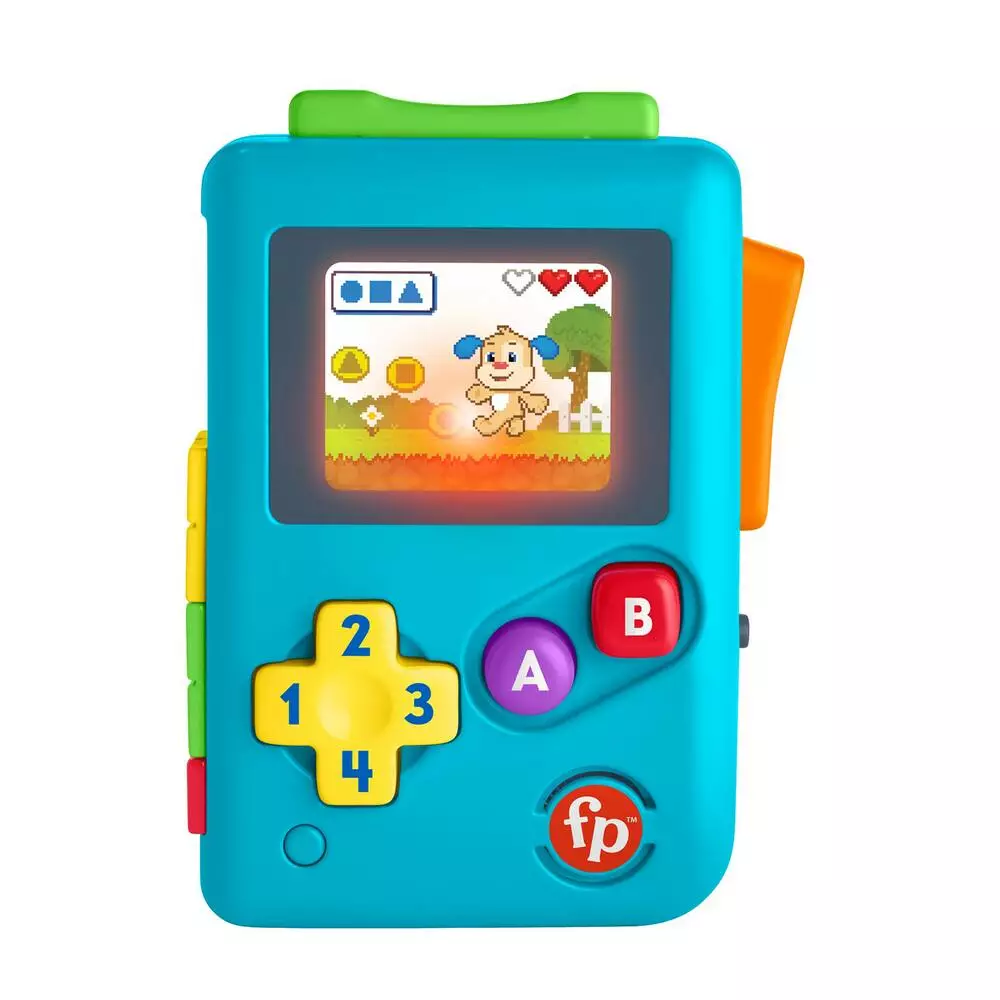 Initiez bébé aux jeux vidéo d’époque avec Ma première console de jeu Rires et Éveil de Fisher-Price. Elle tient dans les mains de bébé et ressemble à s’y méprendre à une vraie console avec sa commande directionnelle et ses boutons A et B, sa fausse cartouche de jeu et son écran qui s’allume. Quand bébé appuie sur les boutons, il entend des chansons, des sons et des phrases rigolotes qui l’initient aux directions, aux couleurs, aux chiffres et aux formes.