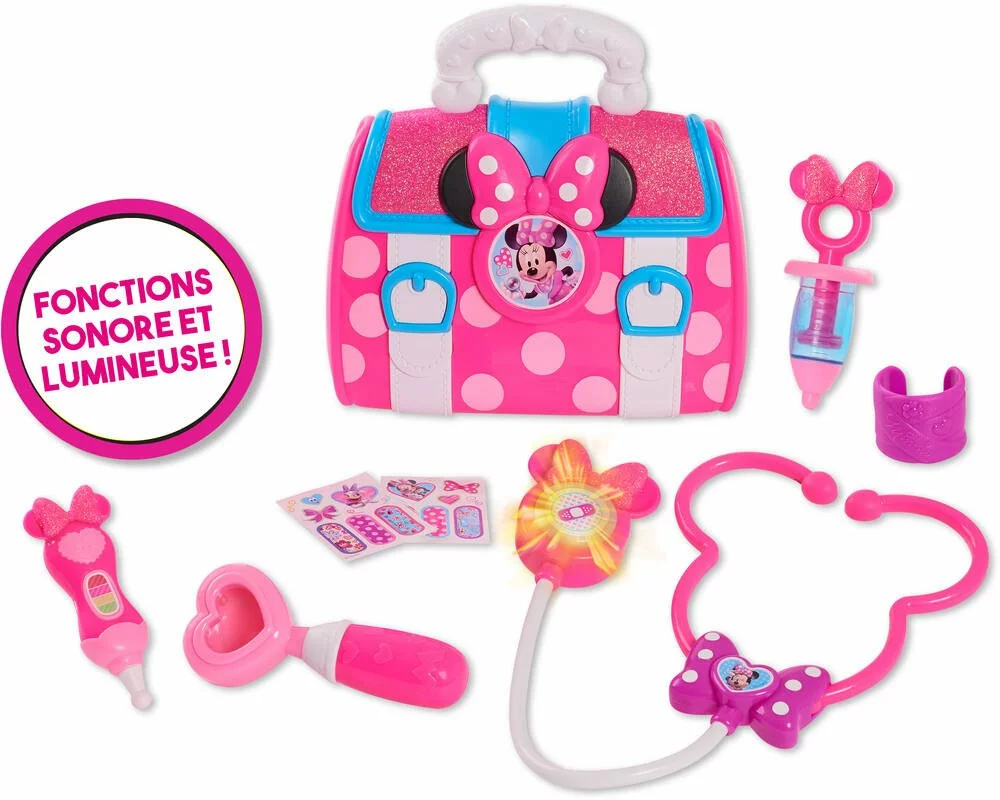 Minnie, Mallette de Docteur, 8 accessoires dont 1 stéthoscope avec fonctions sonores et lumineuses.