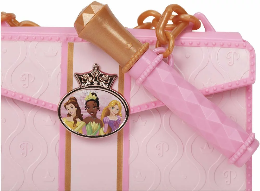 Disney Princesses Style Collection. Coffret contenant : un téléphone, une pochette chic, un tube de brillant à lèvres et 2 cartes de crédits. Téléphone portable avec effets sonores. Le téléphone peut se ranger dans la pochette. Le tube de brillant à lèvres peut s’accrocher à la pochette. La pochette chic contient un miroir à l’intérieur. 3 piles boutons (LR44) fournies. Fonction Try Me. En plastique. Accessoires factices : téléphone, tube de brillant à lèvres et cartes de crédits. Instructions imprimées sur la boîte.
