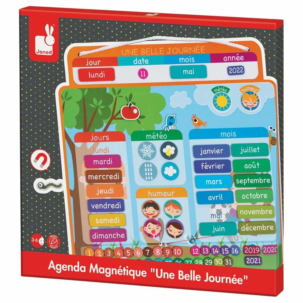 Pour les enfants et les parents désireux de maîtriser le temps ! Composé d’un tableau à suspendre et de 71 magnets pour indiquer la date (jour / mois / année), la météo et l’humeur du moment, chaque jour, tout au long de l’année ! Cet agenda accompagnera votre enfant pour lui apprendre à acquérir la notion du temps tout en devenant autonome.