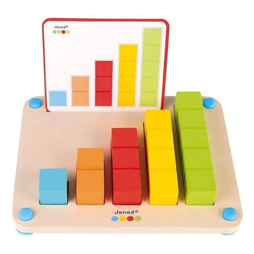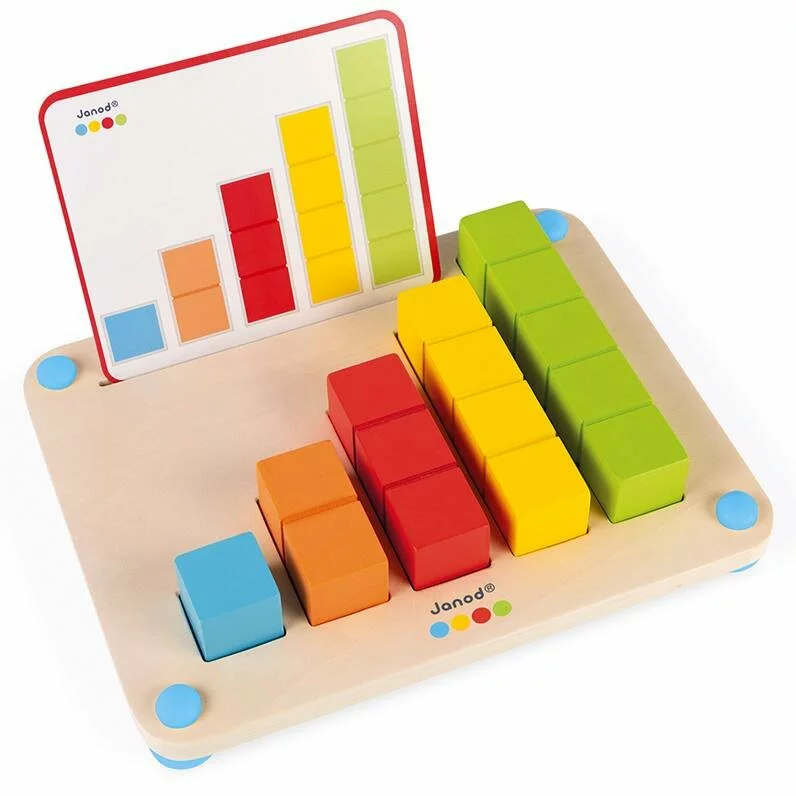 Voici un jeu éducatif pour apprendre à compter et devenir un as des mathématiques tout en s’amusant ! Avec 12 modèles et 14 barres graduées de différentes couleurs et tailles, l’enfant pourra jouer de 2 façons : – Pour les débutants : en plaçant les bâtons au bon endroit sur le plateau pour compter jusqu’à 5 ou pour visualiser les différentes façons de compter en suivant le modèle. – Pour les experts : en réalisant les 1ères additions à l’extérieur du plateau en suivant le modèle. Combien font une barre orange + une barre rouge ? Réponse : une barre verte. Très astucieux, le plateau est équipé de pieds antidérapants en silicone pour plus de stabilité. Ce produit développe la notion d’apprendre à compter, découvrir et expérimenter. Pièces peintes à l’eau. Bois : contreplaqué (plateau), merisier (cubes).