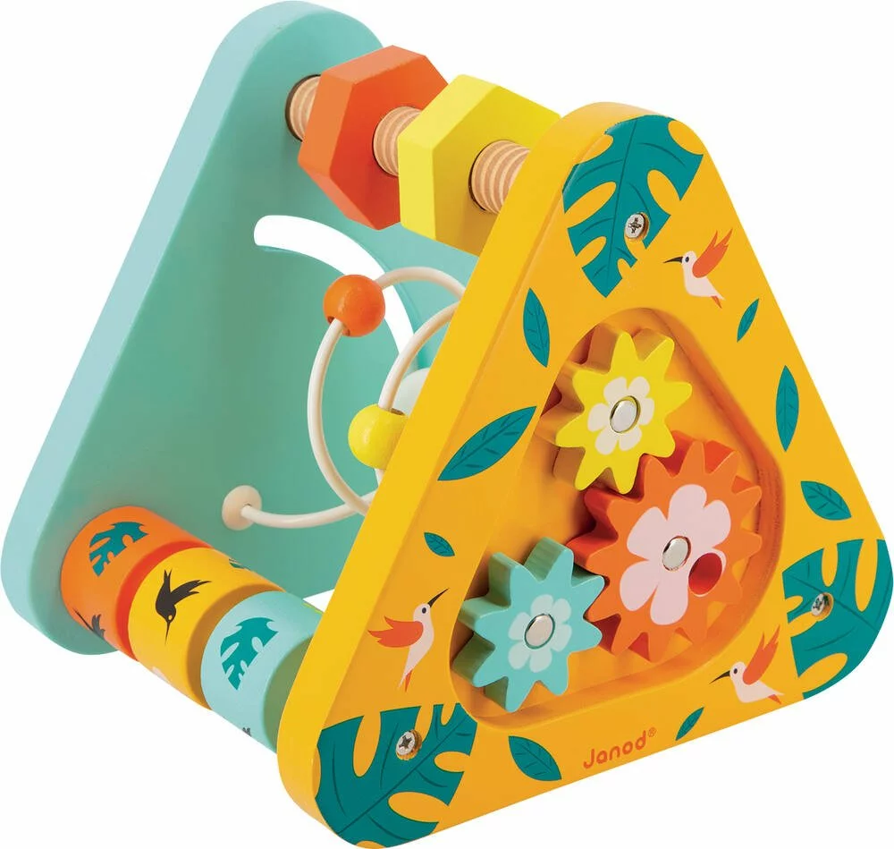 Ce triangle d’activités aux couleurs multivitaminées vous fera voyager sous les tropiques ! Avec ses 7 activités réparties sur ses 2 faces : labyrinthe, miroir, engrenages à tourner, écrous à visser, boulier, bâton de pluie, cylindres à aligner, ce triangle accompagnera votre enfant dans ses premiers apprentissages. Ce triangle stimule l’ouïe, la concentration et la motricité fine. Jouet en bois FSCTM et peinture à l’eau. Jouet d’éveil pour les enfants à partir de 12 mois. Pour créer cette gamme nous avons pris la direction des tropiques à la recherche d’évasion, d’exotisme et de contraste. Pour illustrer au mieux cette nature sauvage, nous avons réuni des animaux joyeux aux couleurs vitaminées et des éléments végétaux aux teintes apaisantes.