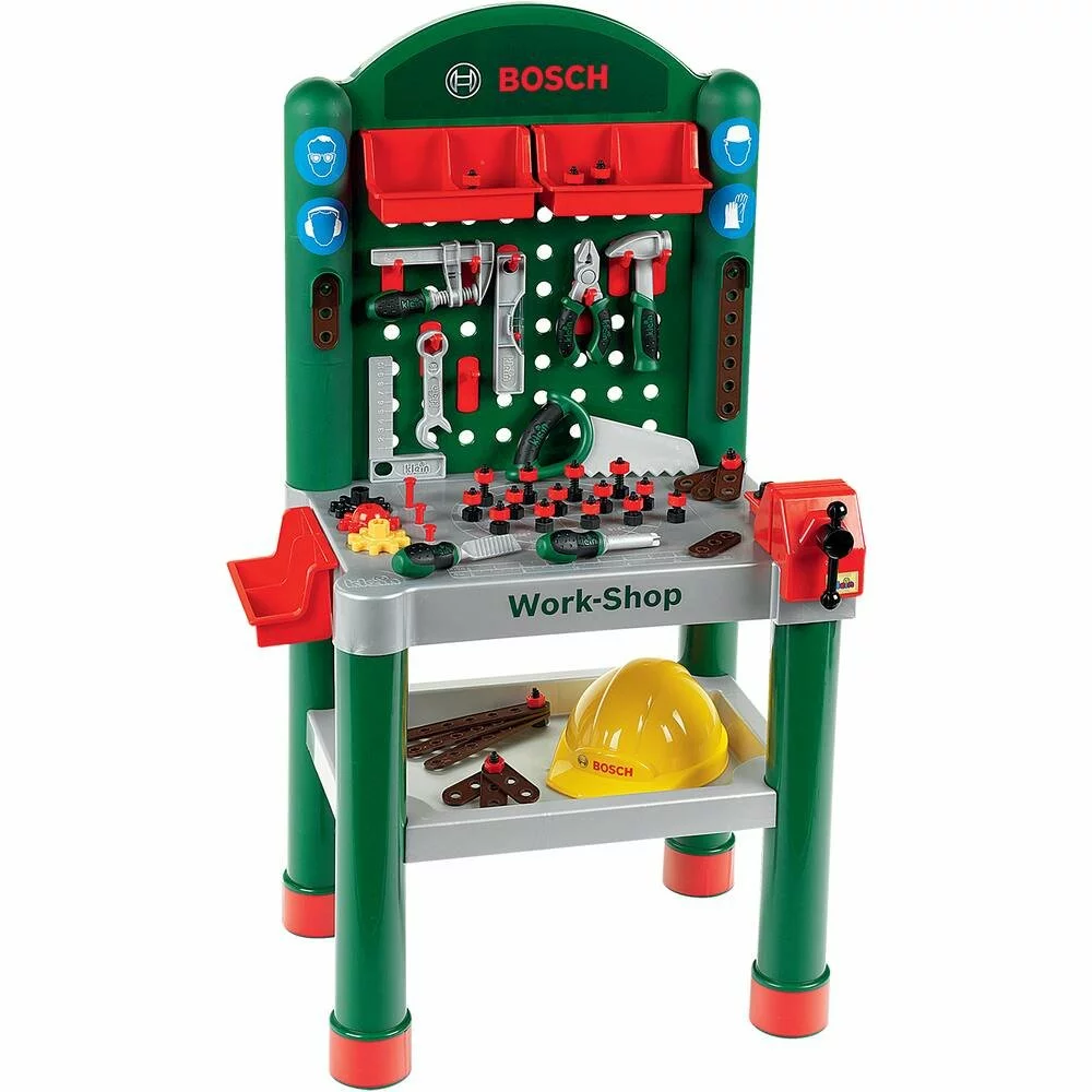 Grand établi Bosch au design ultra-professionnel avec plus de 70 accessoires dont 1 casque de travail et des outils Profiline modernes et robustes. Hauteur : 105 cm.