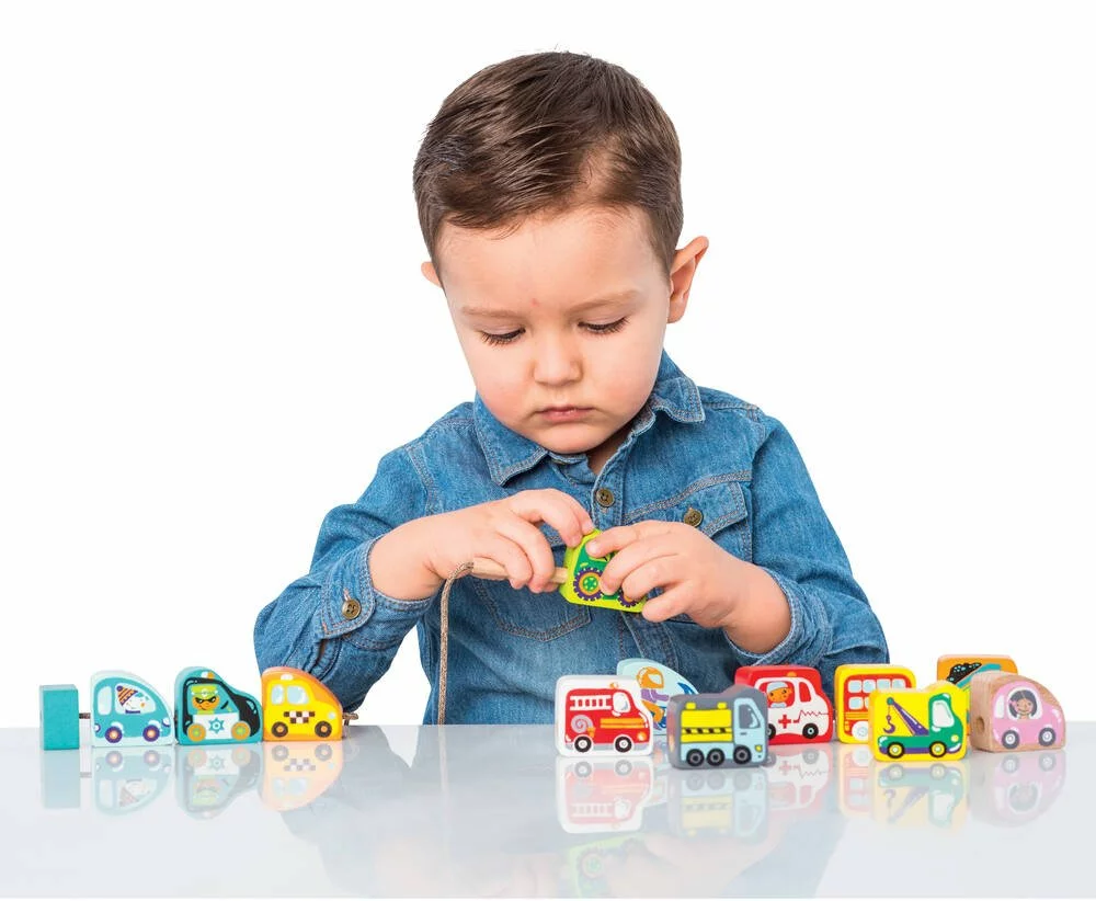 12 blocs en bois à enfiler sur une cordelette à l’aide d’une longue aiguille en bois. Les blocs sont ornés de divers types de véhicules tels que voiture, moto, tracteur, ambulance, taxi, dépanneuse, camion poubelles, pompier, police… 8 cartes fournies pour indiquer à l’enfant différentes séquences pour enfiler les éléments. Les blocs peuvent aussi être utiliser séparément. En bois : hêtre et sycomore. Permet de se familiariser avec les formes et de découvrir les couleurs. Développe la motricité fine et le raisonnement logique. Livré en boîte couleur. Produit en bois certifié.