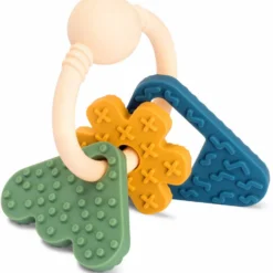 Avec ses formes inspirées de paysages, il fait du bruit grâce à un grelot qui permet de développer l’ouïe. Il est intégralement composé de silicone bénéficiant d’un grade alimentaire (FDA et LFGB standards). Les textures sont multiples permettant ainsi à bébé d’apaiser ses gencives douloureuses pendant les poussées dentaires. Il développe ainsi le toucher grâce à ses formes texturées inspirées de paysages. 3 pièces et un anneau avec grelot : l’ensemble est non détachable. Les pièces passent au lave-vaisselle pour un entretien facilité. Conçu avec une psychomotricienne. Instructions sur la boîte.