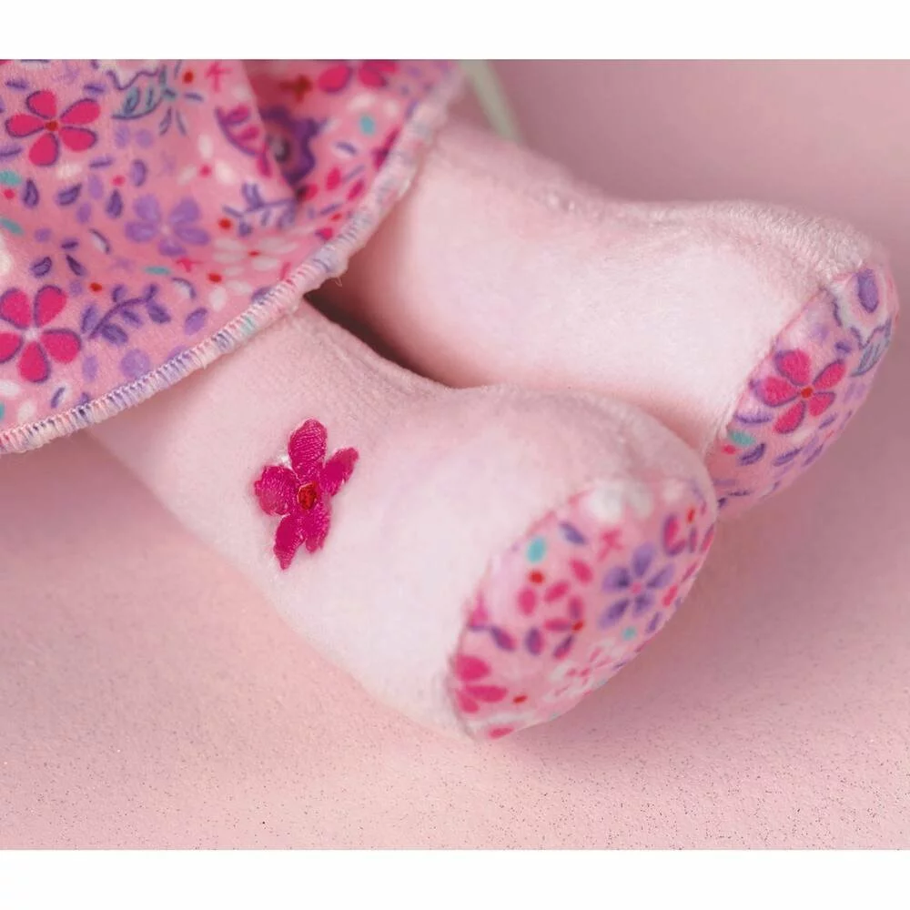 Voici Fleur K, une jolie poupée. La plus joyeuse des Tendresses, elle est si adorable et rafraîchissante avec sa robe fleurie, son bloomer et ses fleurs brodées aux pieds. Les enfants pourront s’amuser à lui retirer son bloomer, imitant ainsi les gestes de maman. Un long ruban dans le dos permet d’y écrire son nom pour la rendre unique. Lavable en machine.