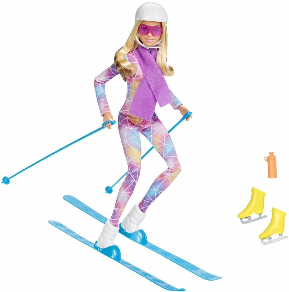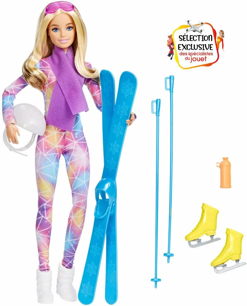POUPEE vêtue d’une tenue de sport d’hiver colorée, ainsi que des accessoires qui lui permettent d’être skieuse ou patineuse.