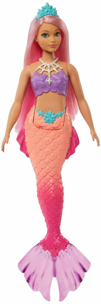 Plongez dans de nouvelles aventures avec les poupées sirènes du royaume de Barbie Dreamtopia ! Cette Barbie sirène affiche un look royal aux couleurs de l’arc-en-ciel propice aux aventures sous-marines : un corsage inspiré de coquillages et une queue à joli dégradé multicolore. Une merveilleuse chevelure rose et un diadème royal viennent compléter sa tenue aux touches marines. Grâce à l’articulation au niveau de la taille, cette Barbie sirène peut « nager » dans l’océan ou s’asseoir pour se prélasser au soleil ! Avec leur look haut en couleur aux détails enchanteurs, les poupées sirènes Barbie Dreamtopia inspireront des aventures merveilleuses aux enfants à partir de 3 ans. Chaque poupée est vendue séparément. Certains produits peuvent ne pas être commercialisés. La poupée ne peut pas nager ou tenir debout toute seule. Les couleurs et les décorations peuvent varier.