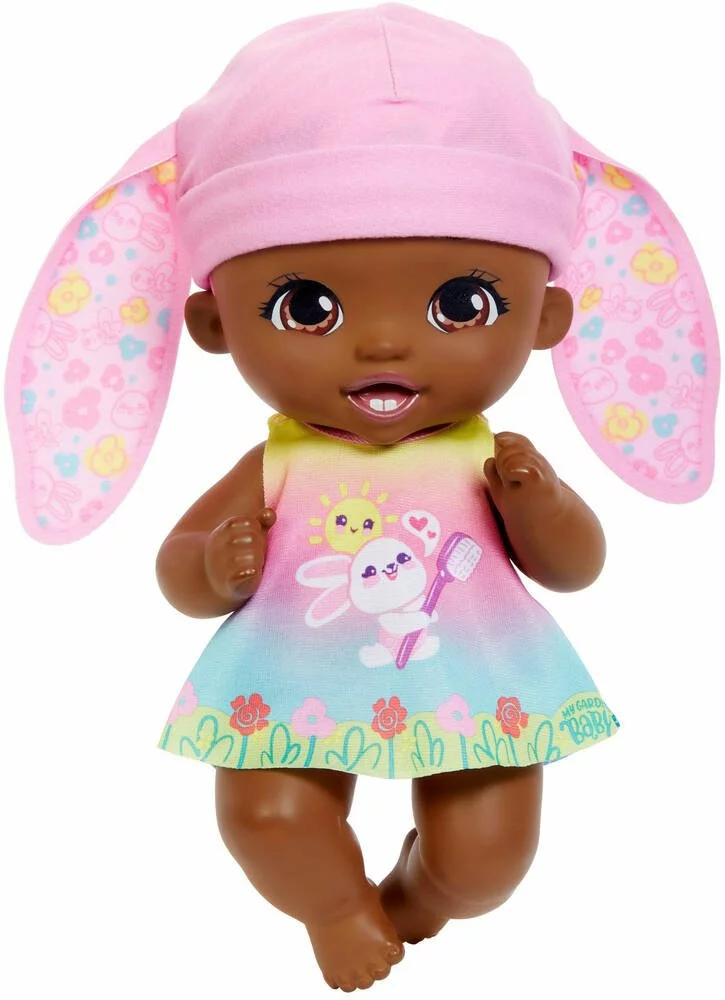Né avec des oreilles souples et un doux parfum de fleur, ce bébé lapin a besoin que l’on prenne bien soin de lui. La tête de la poupée My Garden Baby bouge de droite à gauche quand on lui lave les dents avec la brosse à dents fournie ! Elle poupée porte une adorable tenue réversible 2 en 1 (robe d’été et chemise de nuit) et un bonnet souple pour imaginer l’heure du lever et du coucher. Les enfants peuvent aider bébé à se réveiller, lui brosser les dents, lui donner son anneau de dentition réversible pour soulager ses gencives et le bercer pour qu’il s’endorme plus facilement ! L’emballage se transforme en berceau : placez-y la poupée My Garden Baby pour qu’elle bondisse de rêve en rêve. La poupée mesure environ 30 cm.