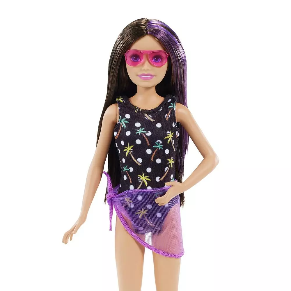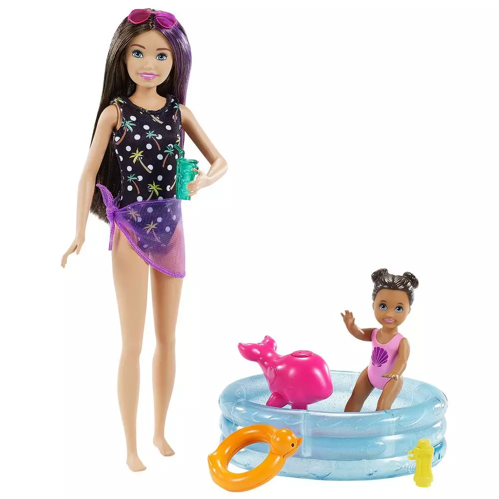 Paréo autour de sa taille, Skipper joue avec une petite fille au bord de la piscine. Six accessoires sont inclus avec les poupées.