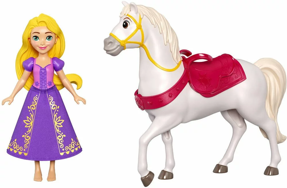 Inspirées du film Disney, cette poupée Raiponce et cette figurine Maximus sont proposées en petit format, ce qui les rend encore plus adorables ! Rayonnante dans sa tenue emblématique de princesse, la mini-poupée articulée Raiponce est accompagnée de son fidèle cheval, Maximus. Les fans vont adorer recréer les meilleurs moments du film Raiponce ou imaginer leurs propres aventures ! La poupée ne tient pas debout toute seule. Les couleurs et les décorations peuvent varier. Raiponce mesure 8,6 cm de hauteur, vêtue de sa jupe en tissu et d’un bustier moulé, elle s’asseoit sur le dos de Maximus grâce au socle qui la maintient.
