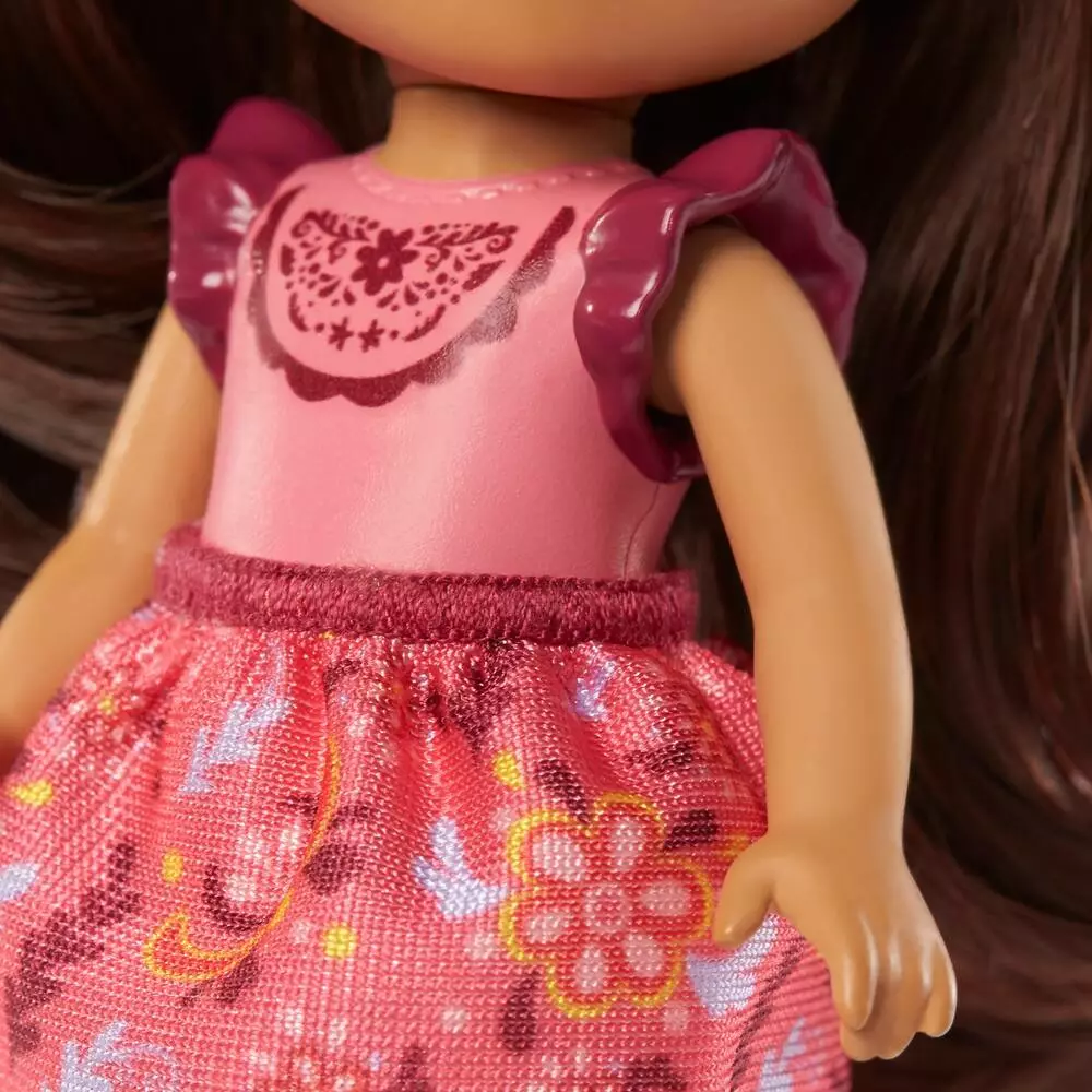 Lucky mesure 14cm de hauteur. La poupée articulée en 5 points porte de longs cheveux à coiffer, une jupette rouge en tissu et un top moulé. Elle est associée à 5 accessoires.
