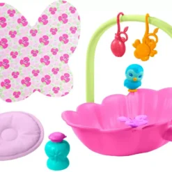 Ce coffret Nénuphar 2 en 1 se compose d’un couffin qui fait également baignoire. A l’heure du bain, remplissez la baignoire d’eau, lavez la poupée My Garden Baby 30 cm (vendue séparément) avec le savon pendant qu’elle joue avec son petit oiseau en plastique et ses jouets de bain qui changent de couleur. Séchez-la ensuite avec la serviette. Au coucher, videz la baignoire, relevez l’anse et suspendez les jouets. Bordez le poupon (non inclus) dans son couffin avec oreiller et couverture. Dès 2 ans