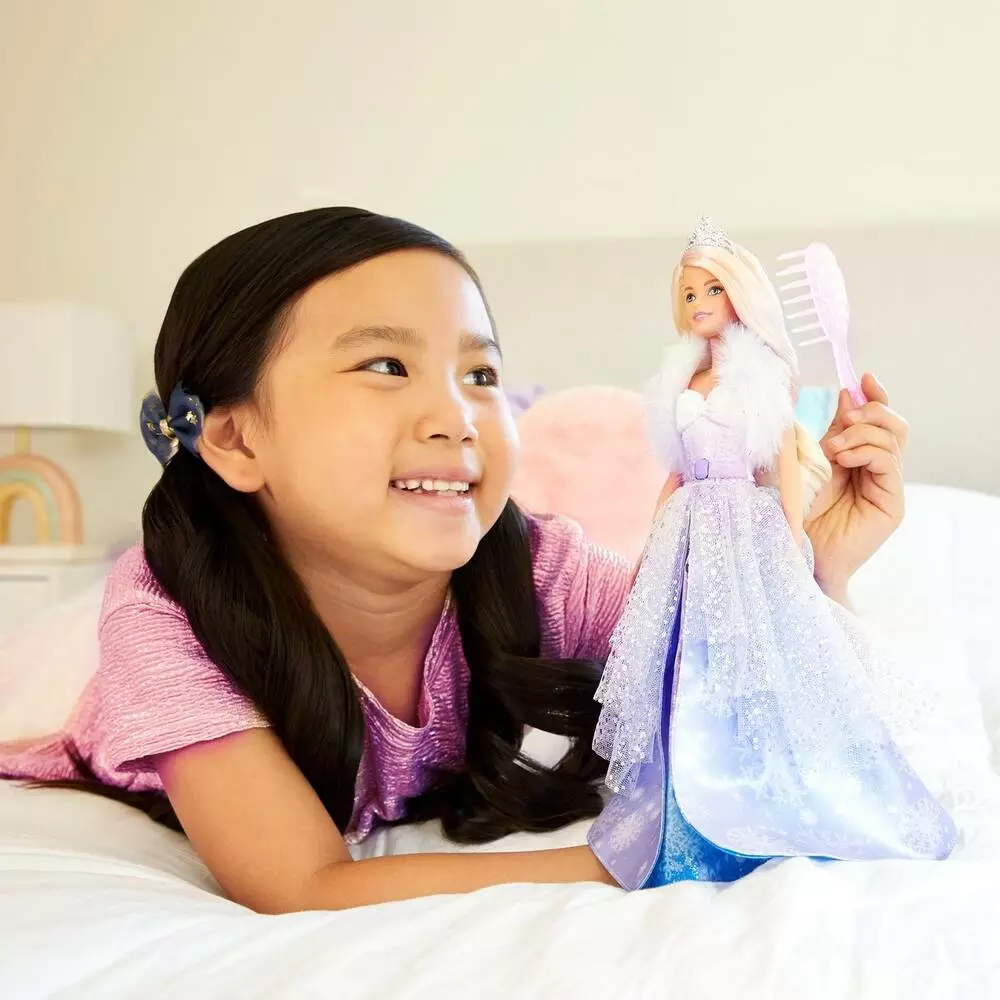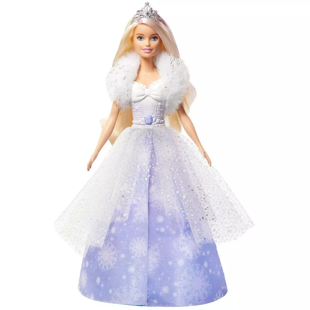 La princesse Barbie est vêtue d’une longue robe pailletée couleur lavande dont le jupon s’évase en éventail par simple pression. Un florilège de motifs aux couleurs froides et nuancées est ainsi dévoilé pour évoquer la magie de l’hiver.