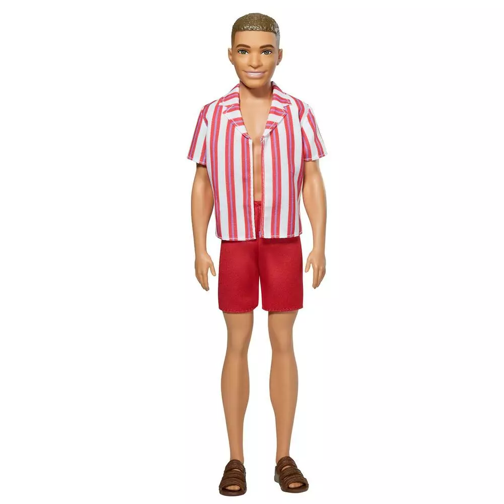 Ce Ken brun retrouve la silhouette et le visage de 1961. En bermuda et chemisette rouges à rayures blanches, il porte une paire de sandales aux pieds.