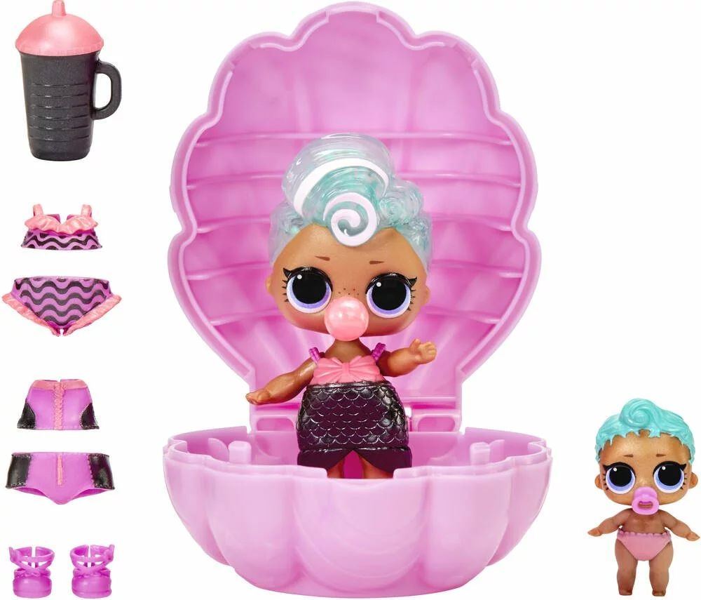 Découvre ta poupée LOL (hauteur : 7,5 cm) et ta poupée Lil Sis (hauteur 3,5 cm) qui changent de couleur au contact de l’eau ! Elles sont cachées dans un cœur effervescent ! Avec 6 surprises incluses.