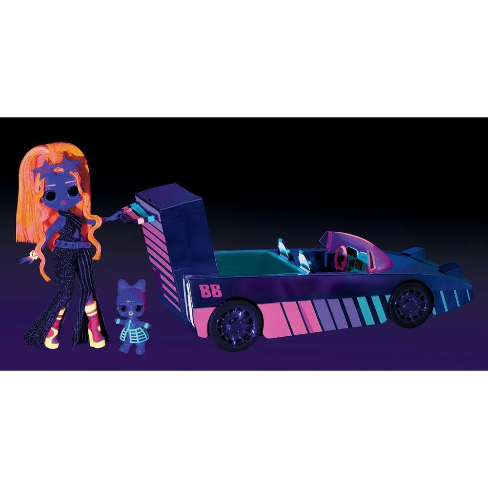 VĂ©hicule avec siĂšges rĂ©glables, piscine et piste de danse ! Les phares s’allument. Contient 1 poupĂ©e (7,5 cm). Autres poupĂ©es non incluses.