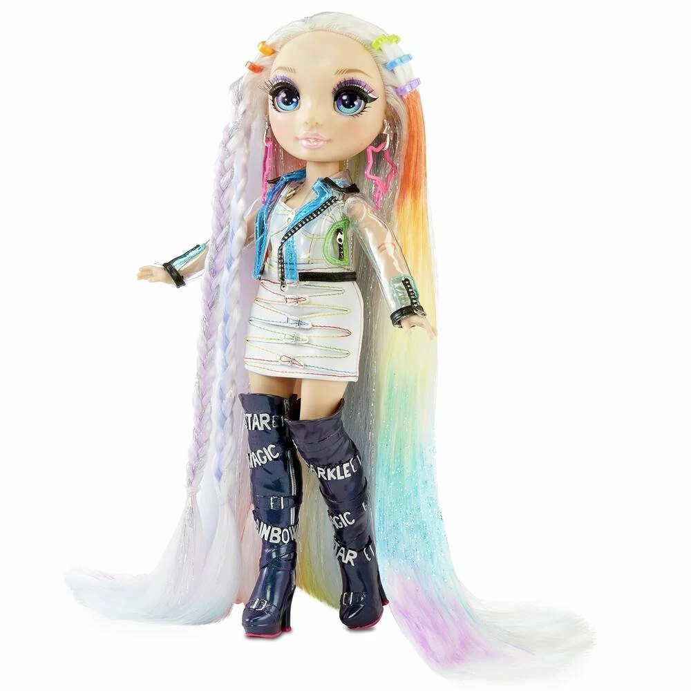 Suivez l’arc-en-ciel et atteignez Rainbow High. Seuls ceux avec un goût exceptionnel auront accès à cette école de mode haute en couleurs. Collectionnez dès maintenant les Rainbow High et constituez votre arc-en-ciel de poupées mannequins. Retrouvez la poupée Amaya Raine dans un set de création capillaire haut en couleurs !
