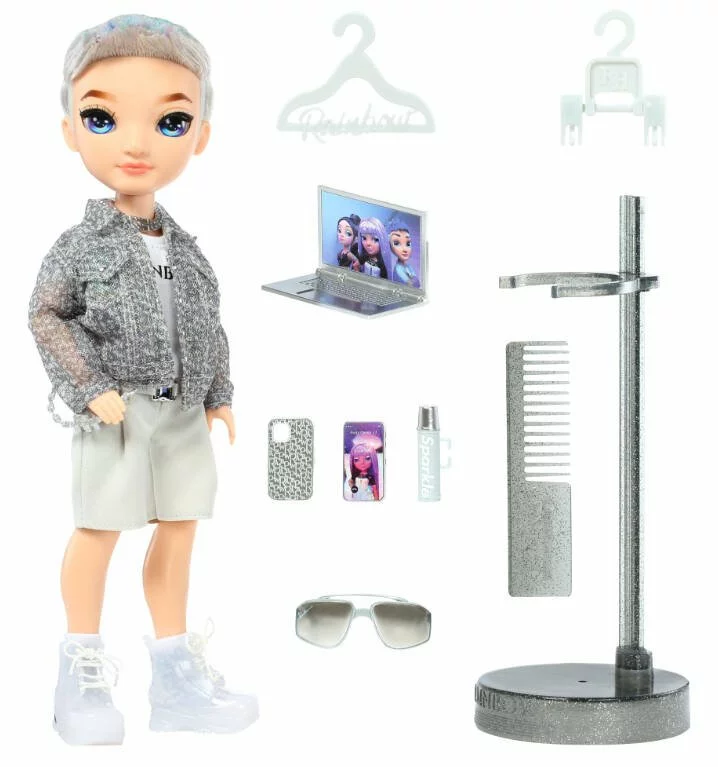Poupée articulée avec 1 tenue, 1 paire de chaussures, 2 cintres, 1 peigne, 1 support et des accessoires.