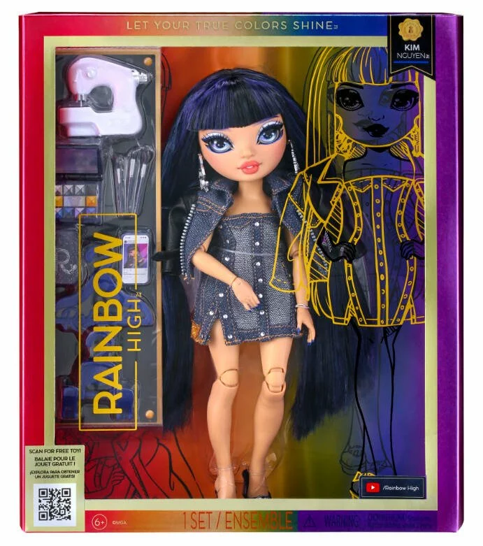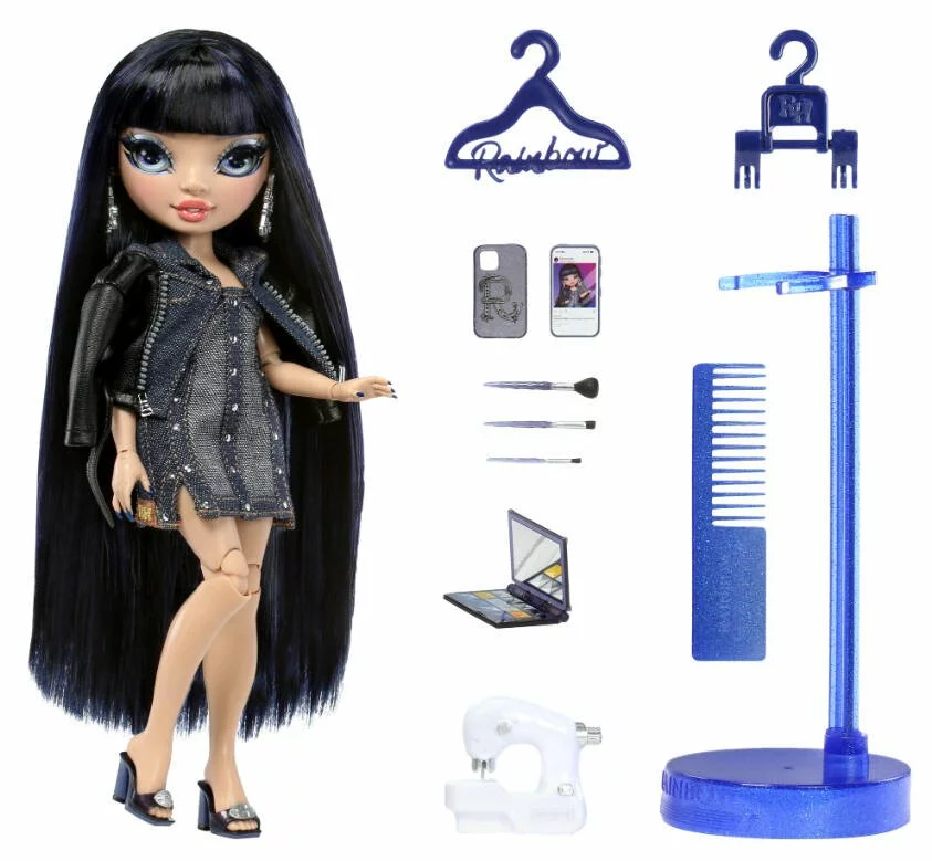 Poupée articulée avec 1 tenue, 1 paire de chaussures, 2 cintres, 1 peigne, 1 support et des accessoires.