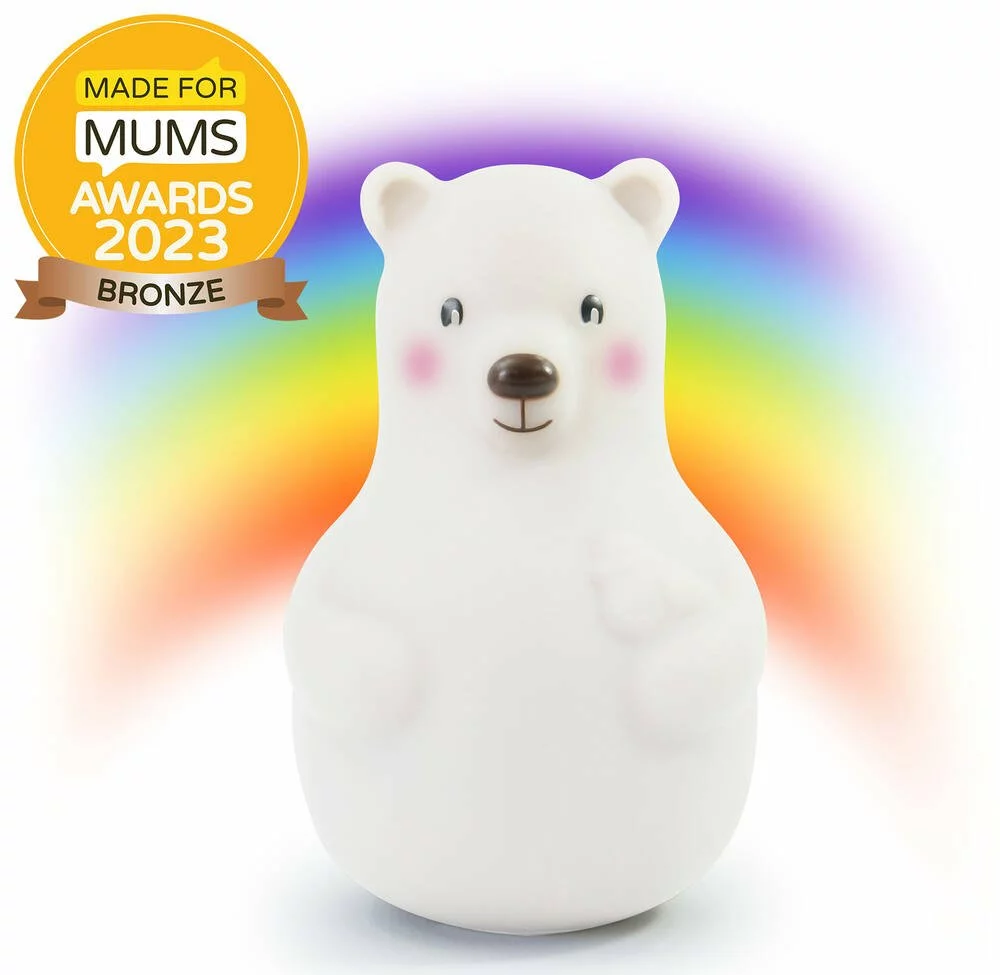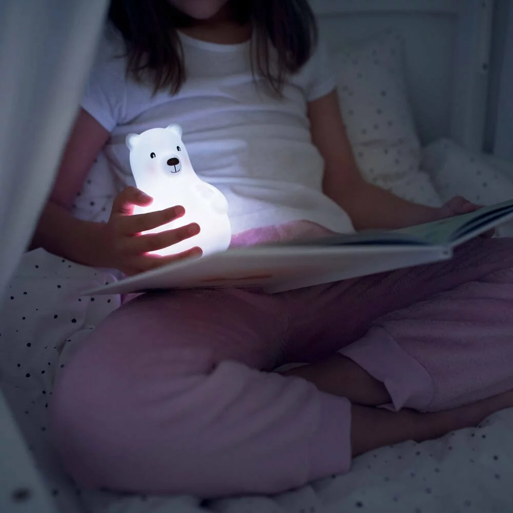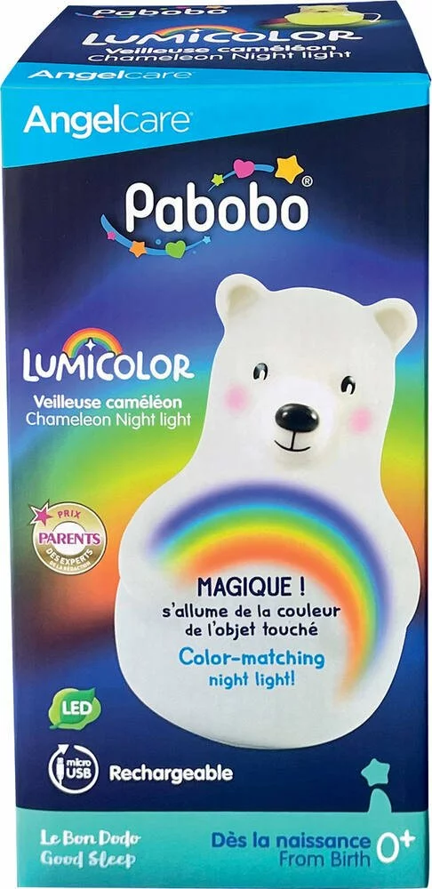 Ce petit ours lumineux multifonctions est magique : Posez-le sur une surface colorée et il s’allume de la même teinte ! Un compagnon ludique pour apprendre les couleurs ! Cet ours magique a plus d’un tour dans son sac pour s’adapter aux besoins des enfants : Il peut aussi s’utiliser en mode lumière blanche chaude (2 intensités) ou encore s’allumer en mode couleurs changeantes : la veilleuse change de couleur automatiquement. Pratique, elle s’éteint automatiquement. Sans piles, elle est rechargeable micro-USB.