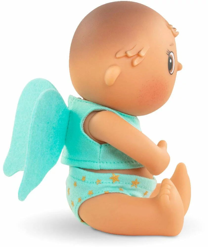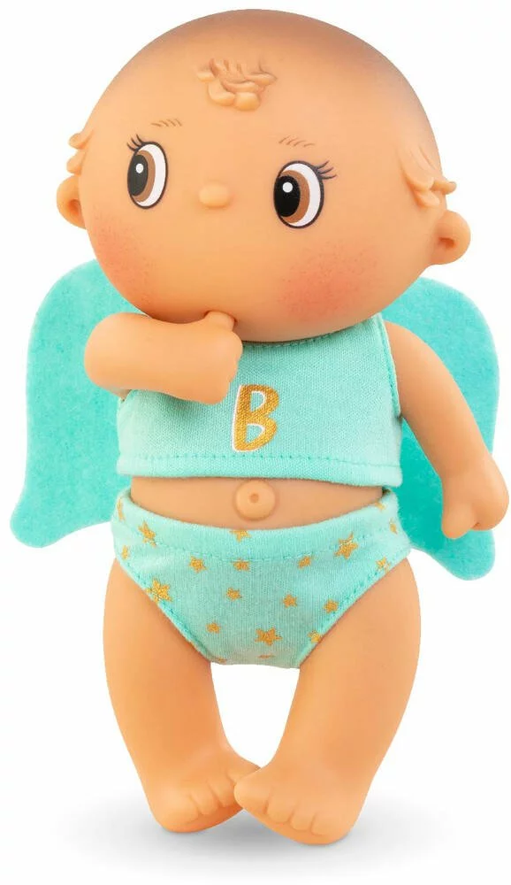 Mini poupon polisson de 20 cm. Les Beedibies ont un corps vinyle et des yeux peints. Comment ne pas être séduit par leur regard en coin ? Ils sucent leur pouce. Leur petit nombril proéminet est très rigolo ! Beedibies Gaspard est habillé tel un ange; avec de belles ailes vertes (non amovibles) dans le dos. Il arbore fièrement un B doré sur le devant de son t-shirt vert et porte une culotte assortie verte avec des étoiles dorées. Tous les Beedibies ont une délicate senteur de vanille. 3 modèles à collectionner. Dès 3 ans.