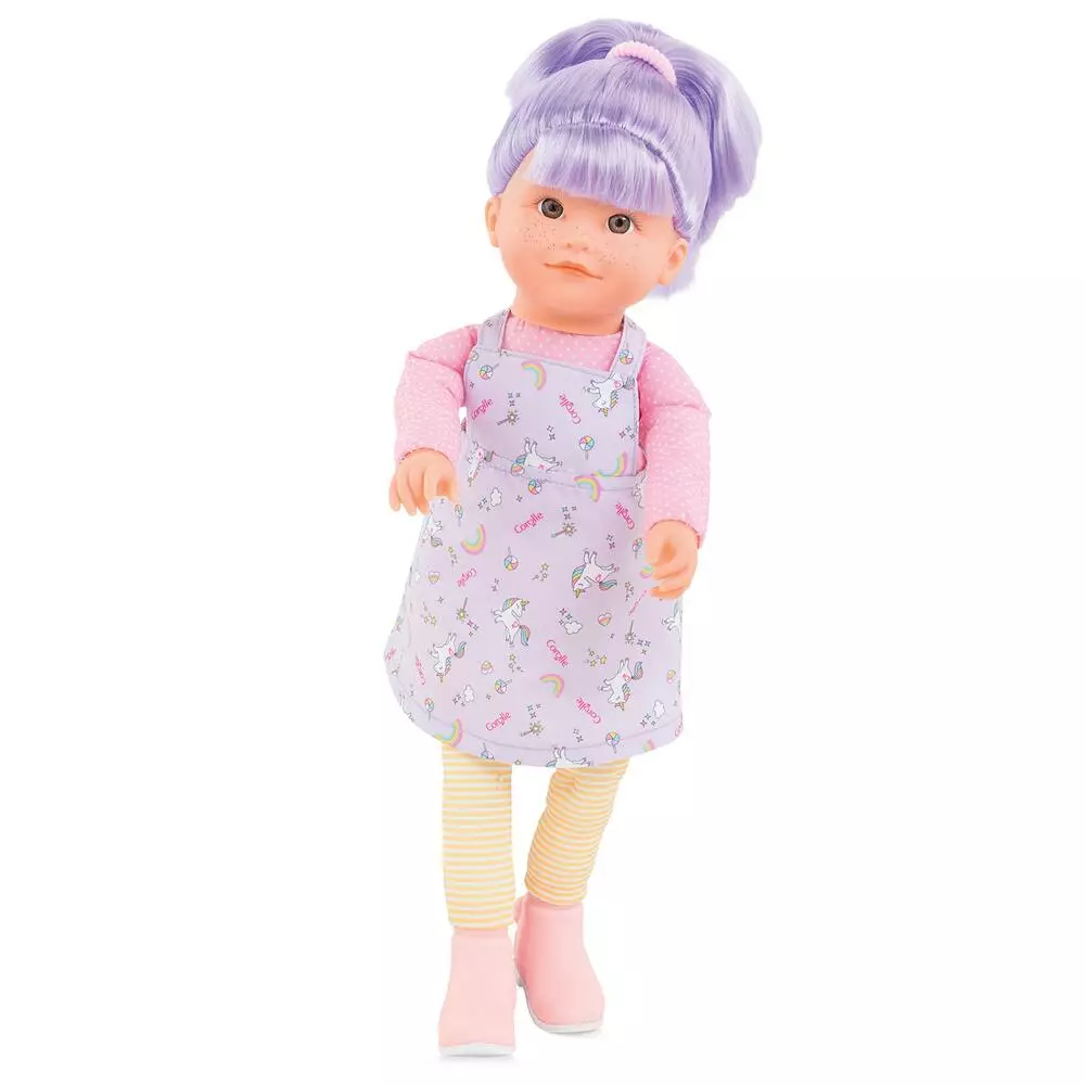 Vois la vie en couleurs avec les Rainbow Dolls ! Fais la connaissance d’une bande de 4 joyeux personnages qui vivent au-dessus des nuages dans un monde fun et rigolo où les licornes se baladent au milieu des champs de barbe à papa !Iris est une grande poupée pétillante de 40cm au look fun et coloré ! Elle est habillée d’une robe réalisée dans un tissu exclusif Corolle très tendance; avec des arcs-en-ciel et des licornes. Elle est chaussée d’une paire de bottines derbies assorties non retirables.Son corps souple et léger; ainsi que ses longs bras et ses jambes interminables lui permettent de prendre toutes les positions. Ses mains et sa tête sont en vinyle doux au toucher et à la délicate senteur de vanille. Son visage est constellé de petites taches de rousseur et ses yeux marron sont fixes. Les cheveux d’Iris sont d’un violet éclatant. Elle possède une frange et une queue de cheval tenue par un chouchou.