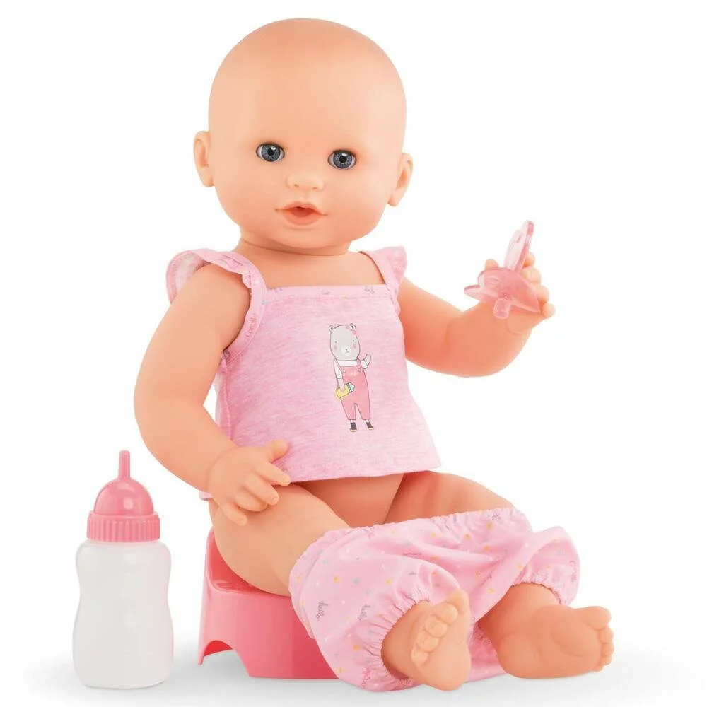 Emma Fait Pipi est un grand poupon Corolle pour jouer et faire comme les grands. Avec son pot, son biberon à remplir et sa tétine, c’est l’allié pour l’apprentissage de la propreté ! Baignoire non incluse. Ce grand poupon Corolle sexué fille : boit son biberon qui peut être rempli d’eau ; fait pipi « pour de vrai » sur son pot lorsqu’on lui appuie sur le ventre (plus d’eau partout dans la maison !) et prend son bain. Grâce à son corps, à la délicate senteur de vanille, totalement en vinyle doux au toucher, il peut aller dans l’eau tout en tenant assis. Il mesure 36 cm, une taille parfaitement adaptée aux petits bras de l’enfant pour le câliner, le materner et reproduire les gestes qui font devenir grand. Avec ses yeux dormeurs, il fait dodo quand on le couche sur le dos. Il est habillé d’un bloomer et d’un débardeur.