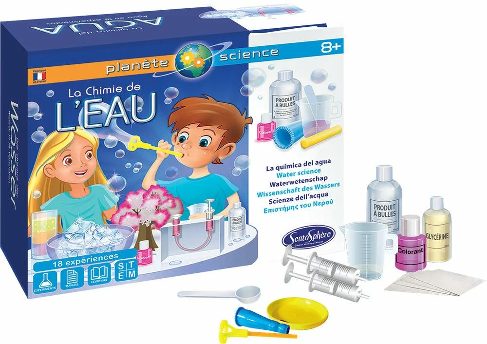 Avec ce coffret tu vas pouvoir découvrir les phénomènes de pression, de transfert, d’absorption, la distillation, la filtration, la condensation, mais également la chimie des bulles. 18 expériences passionnantes pour s’amuser à comprendre la chimie et la physique de l’élément le plus essentielle à la vie : l’eau. Contenu : 1 flacon de produit à bulles, 1 flacon de glycérine, 1 colorant violet, 1 sachet d’instruments à bulle, 2 seringues en plastique, 1 tube en silicone, 1 ballon, du papier pour chromatographie, 1 pipette, 1 cuillère doseuse, 1 bécher, 1 mini cuillère et 1 notice.