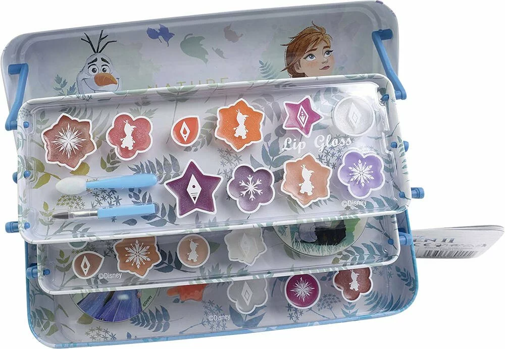 Le monde magique du maquillage d’Anna et Elsa t’attend ! Dans ce joli plumier de maquillage en métal Disney La Reine de Neiges 2 avec 3 niveaux vous trouverez tout le maquillage dont vous avez besoin pour être la plus jolie des Princesses. Ce plumier réutilisable (par exemple pour y ranger tes crayons) contient 8 crèmes scintillantes, 16 teintes pour les lèvres, des stickers autocollants, 1 pinceau lèvres et 1 pinceau embout mousse. De formules sécurisées et sans cruauté : adapté aux enfants de plus de 3 ans, le maquillage Disney est conforme à toutes les normes de cosmétiques EU ainsi qu’aux directives européennes de jouet.